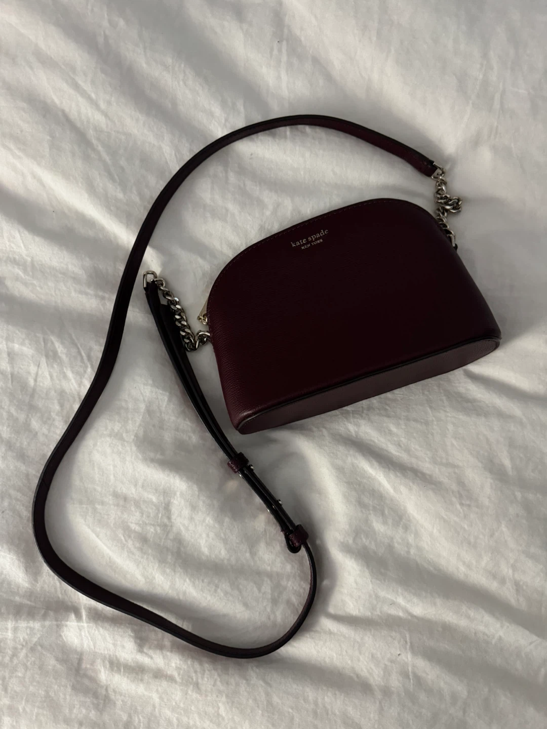 This is a burgundy leather crossbody bag from Kate Spade New York. It features a pebble leather exterior and a silver-toned chain strap. Perfect for everyday use! I can send a video if you’re interested.