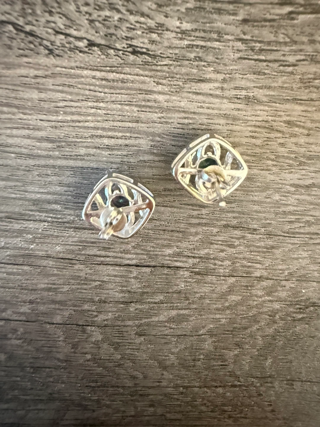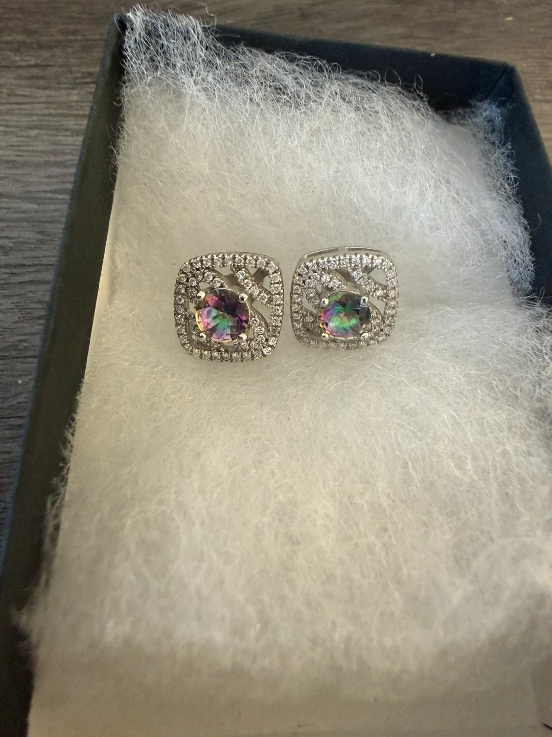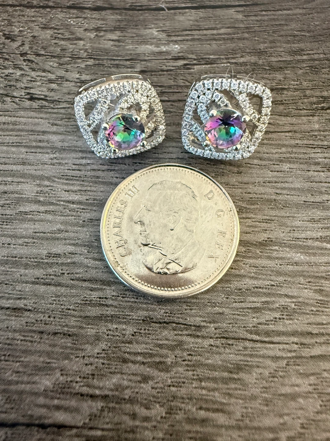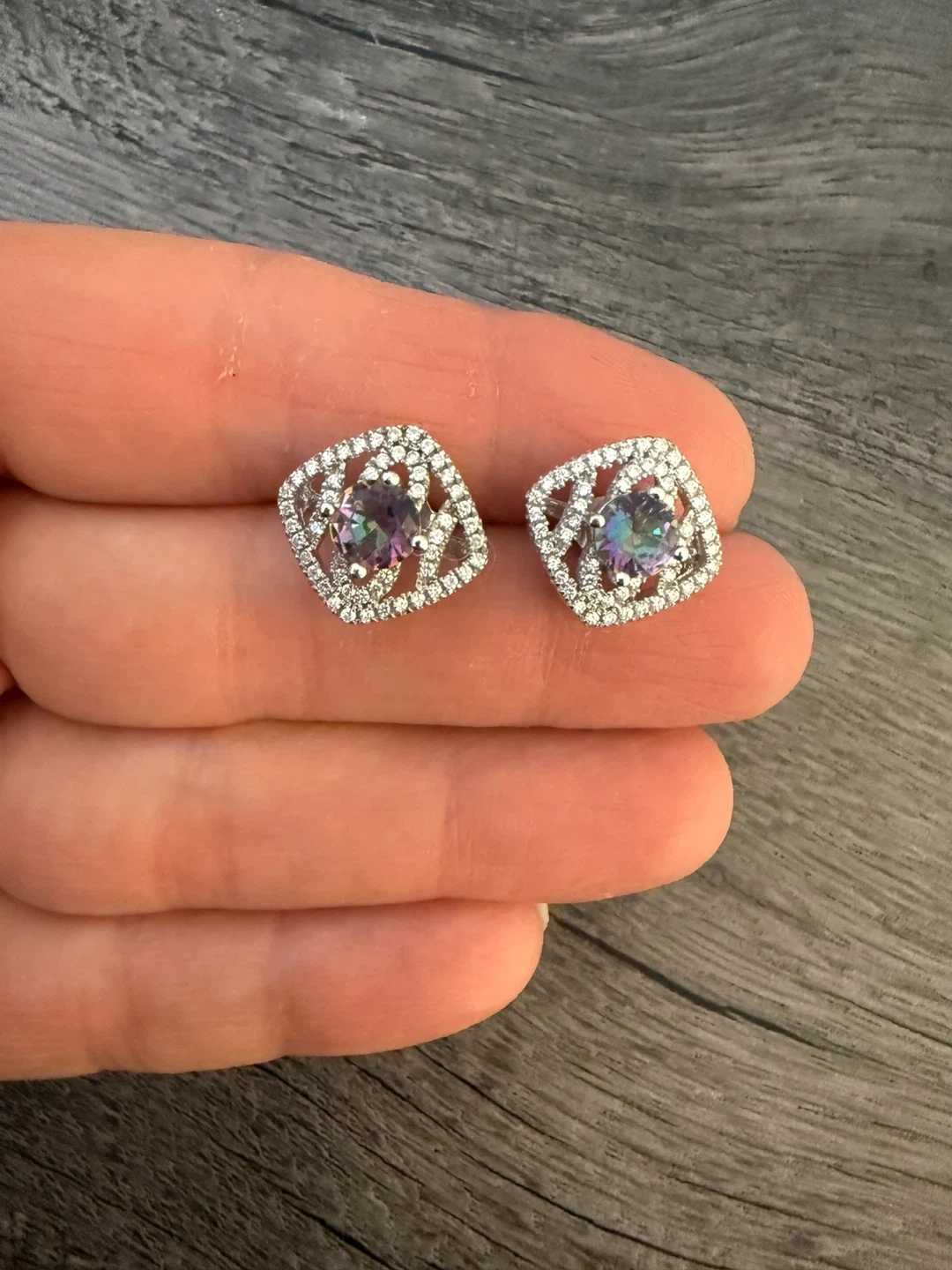 Pretty sterling silver stud earrings featuring a square halo design. It's encrusted with small rhinestones surrounding a Mystic Topaz that shows a rainbow of colours. These earrings have post-back closures. They'd add a lovely touch of sparkle to any outfit!