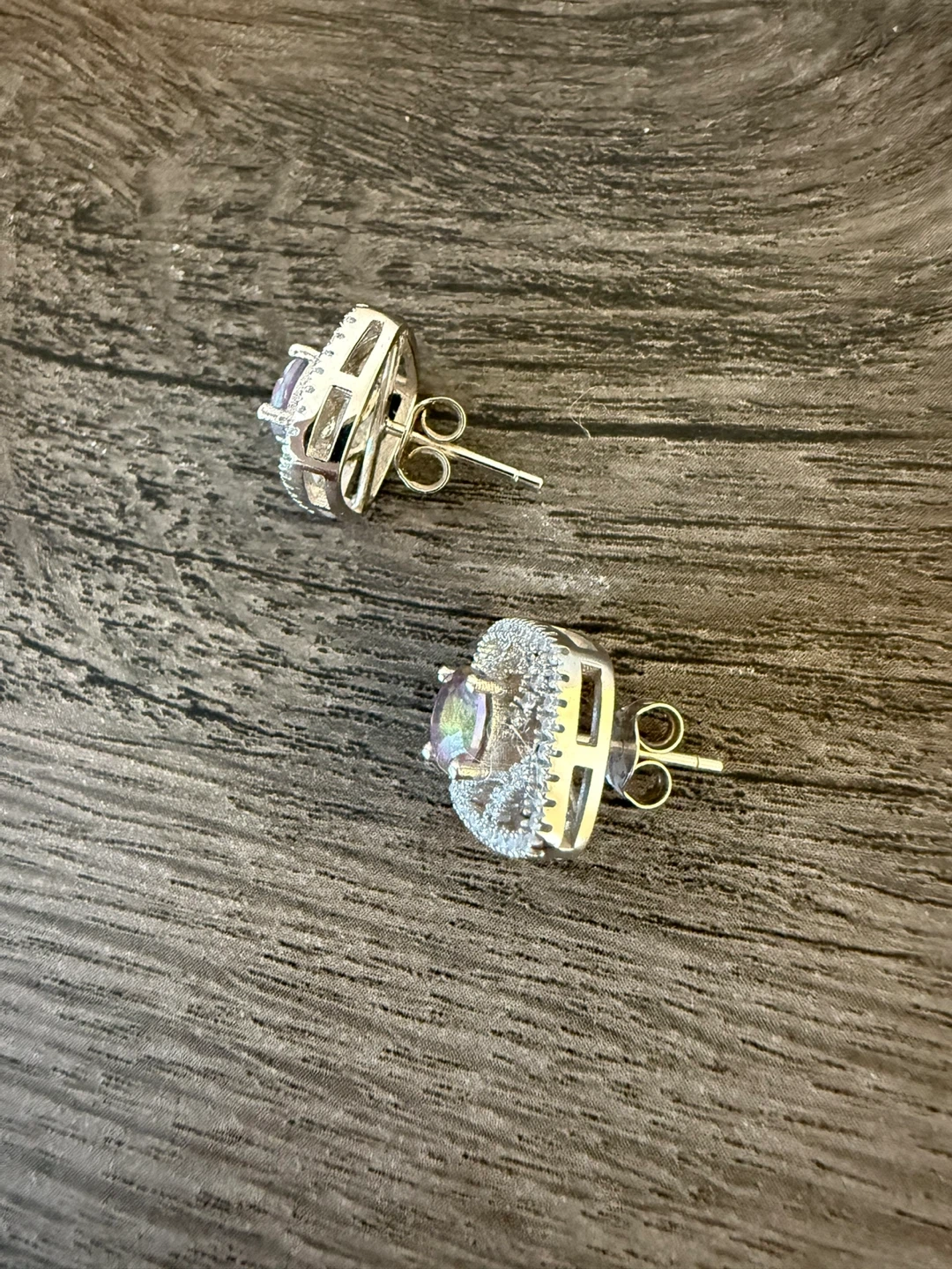 Pretty sterling silver stud earrings featuring a square halo design. It's encrusted with small rhinestones surrounding a Mystic Topaz that shows a rainbow of colours. These earrings have post-back closures. They'd add a lovely touch of sparkle to any outfit!