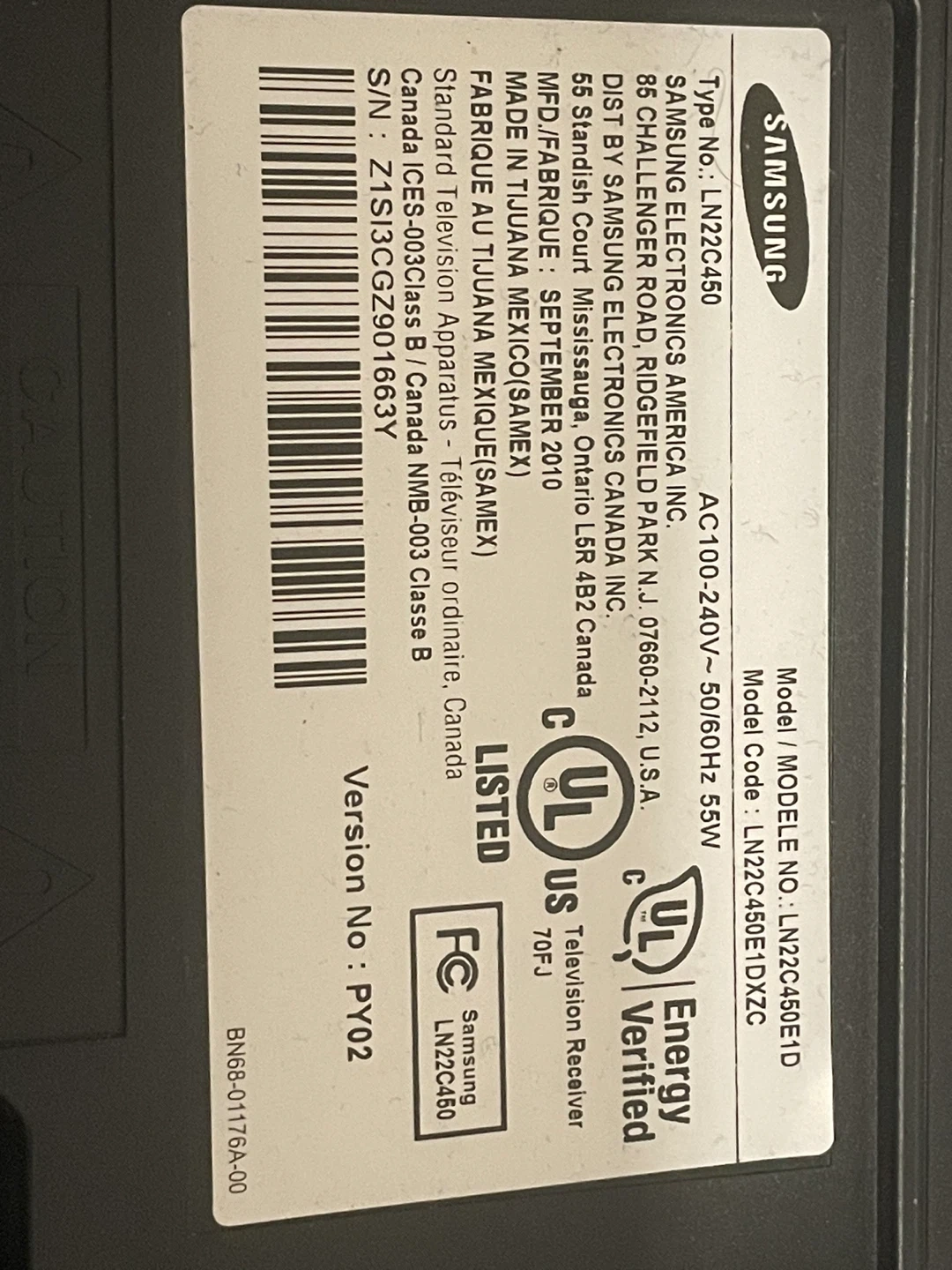 This is a Samsung LN22C450 television. It's a 22-inch screen with HD resolution. The model code is LN22C450E1DXZC.