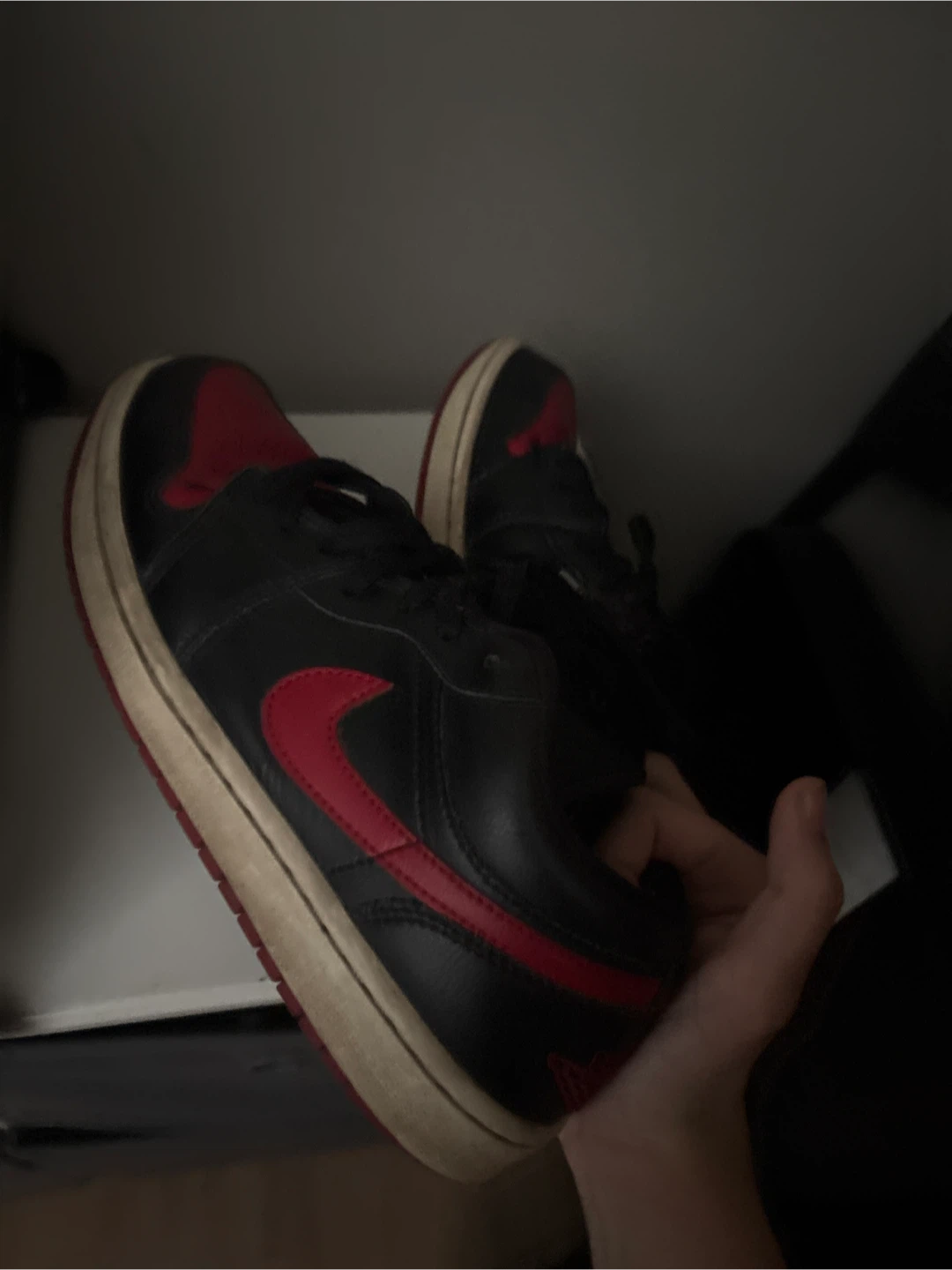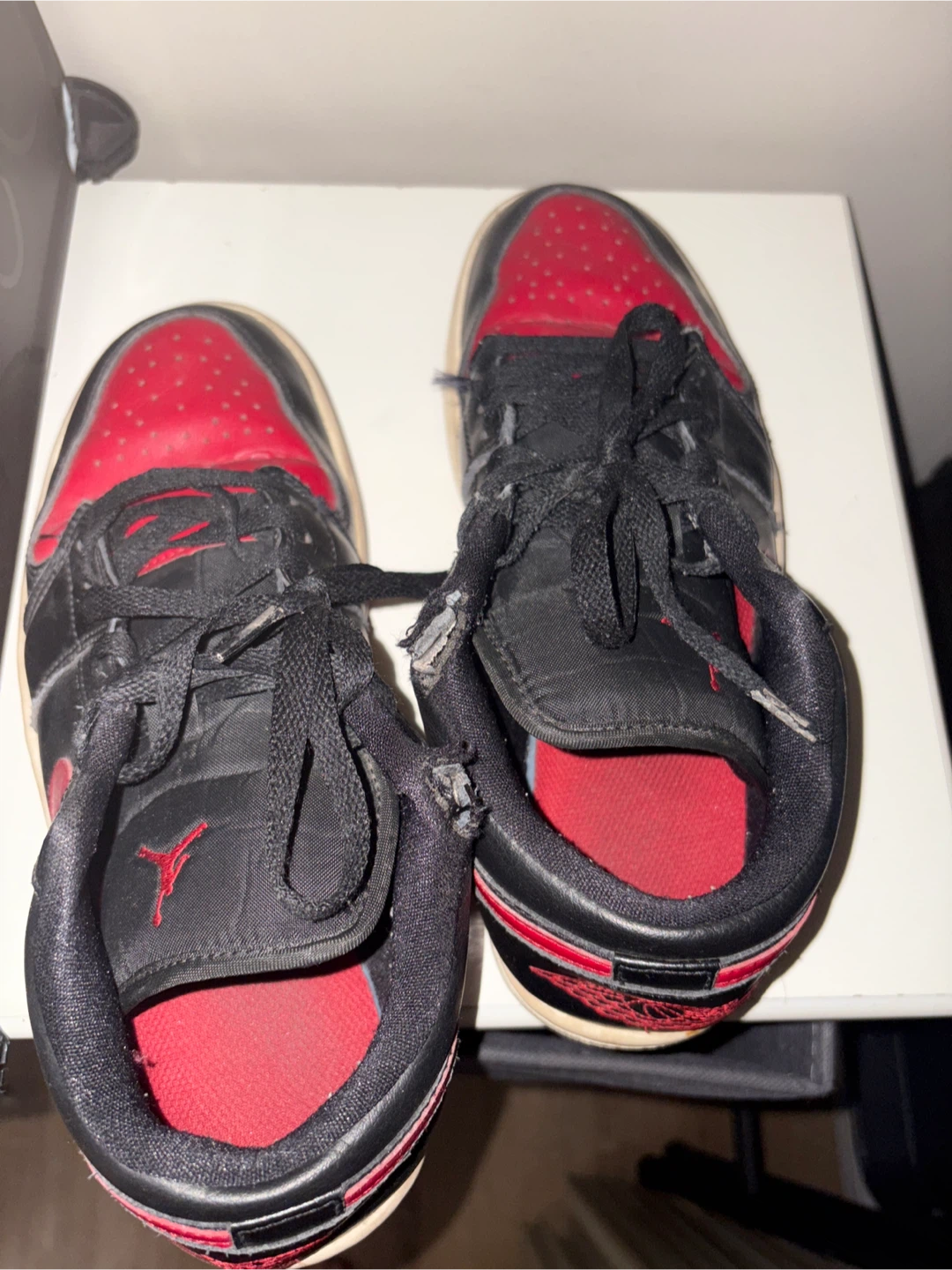 Selling a pair of Nike Air Jordan 1 Low sneakers in size 8.5. They show signs of wear, as you can see in the photos, but still have lots of life left!