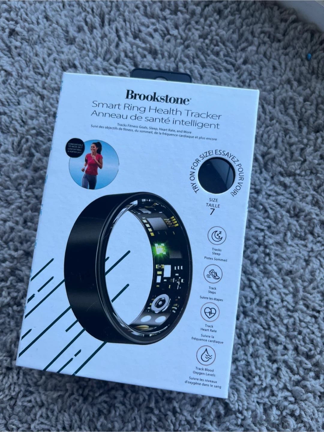 This Brookstone smart ring tracker monitors your activity and health. It tracks steps, sleep, heart rate, and blood oxygen levels. The ring comes in size 7.