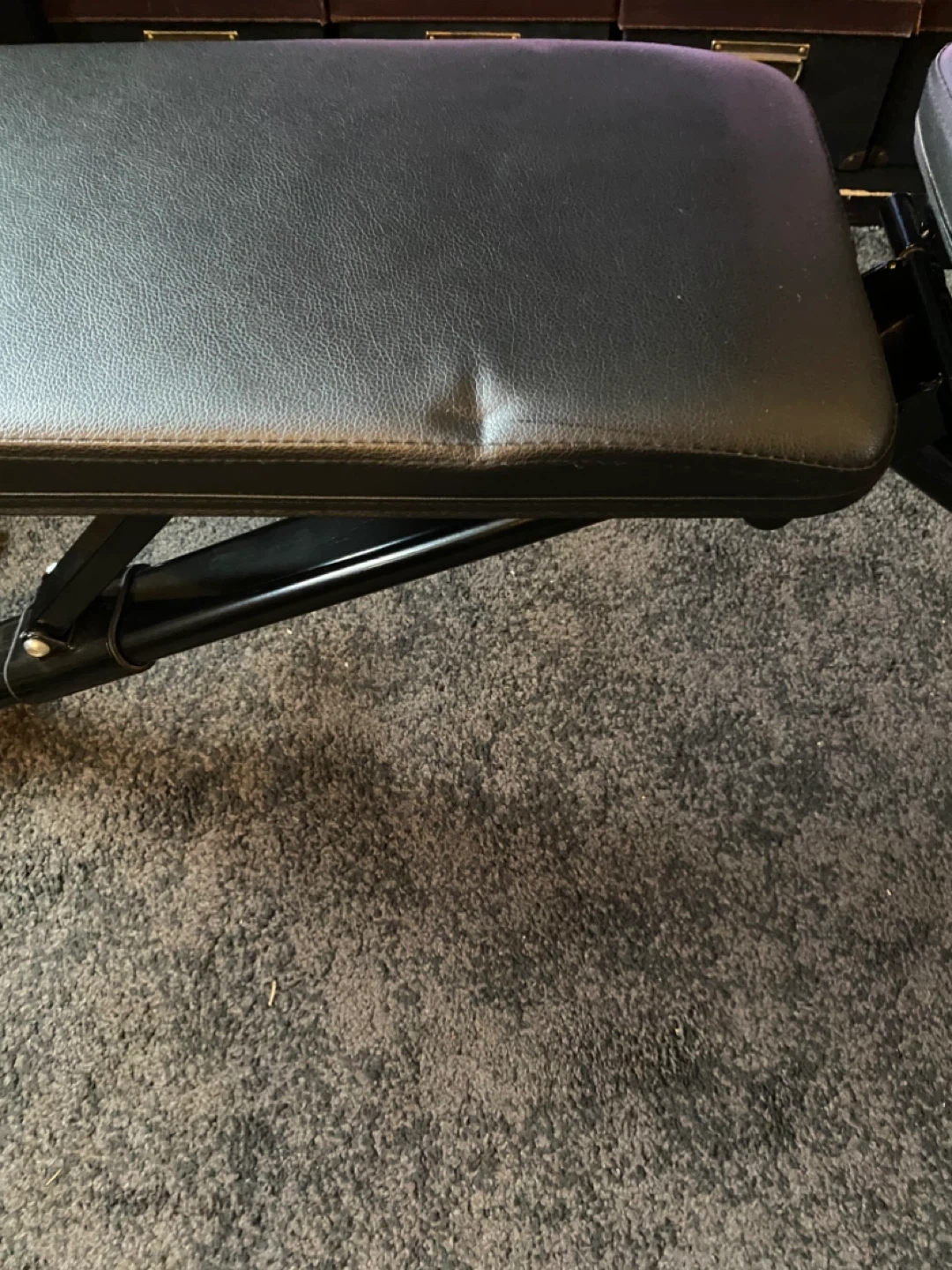 Has been sitting in storage. Has an indent on pad from item being stored on it. Does not effect performance.
