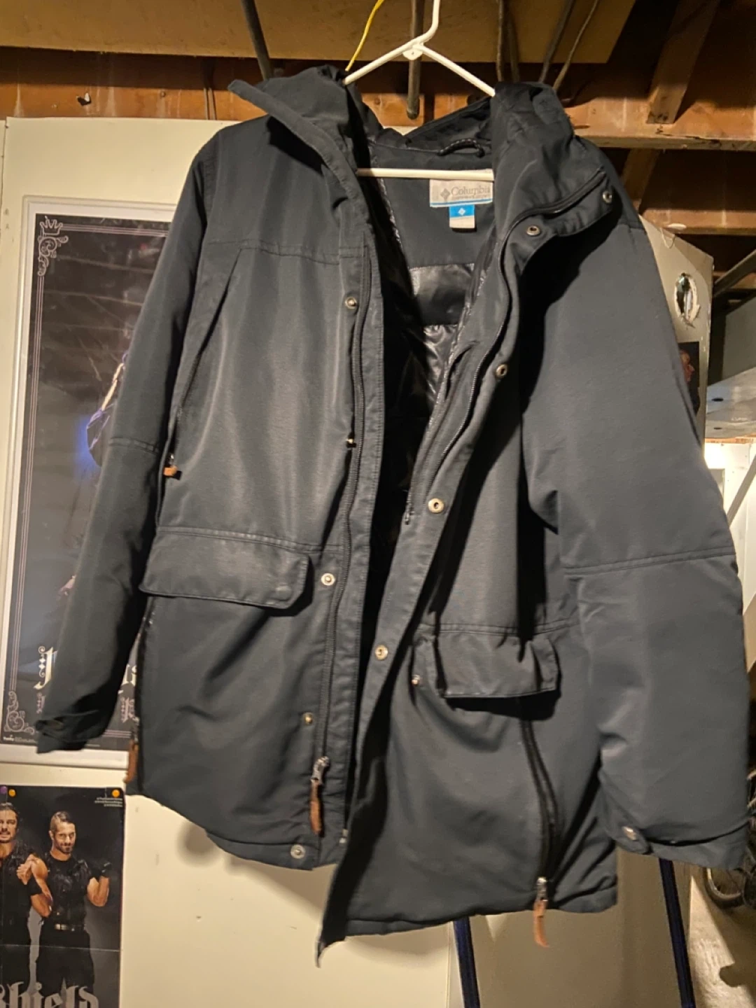 This Columbia winter jacket is dark blue and a size large. It's made for cold weather. It's perfect for staying warm during the winter months!