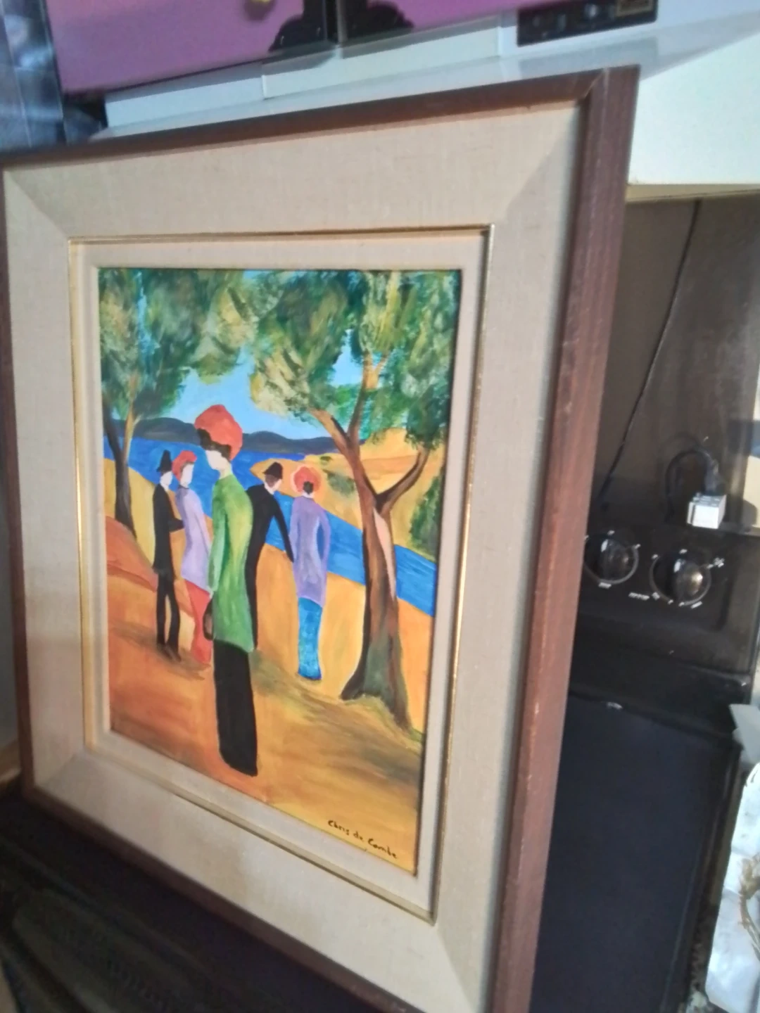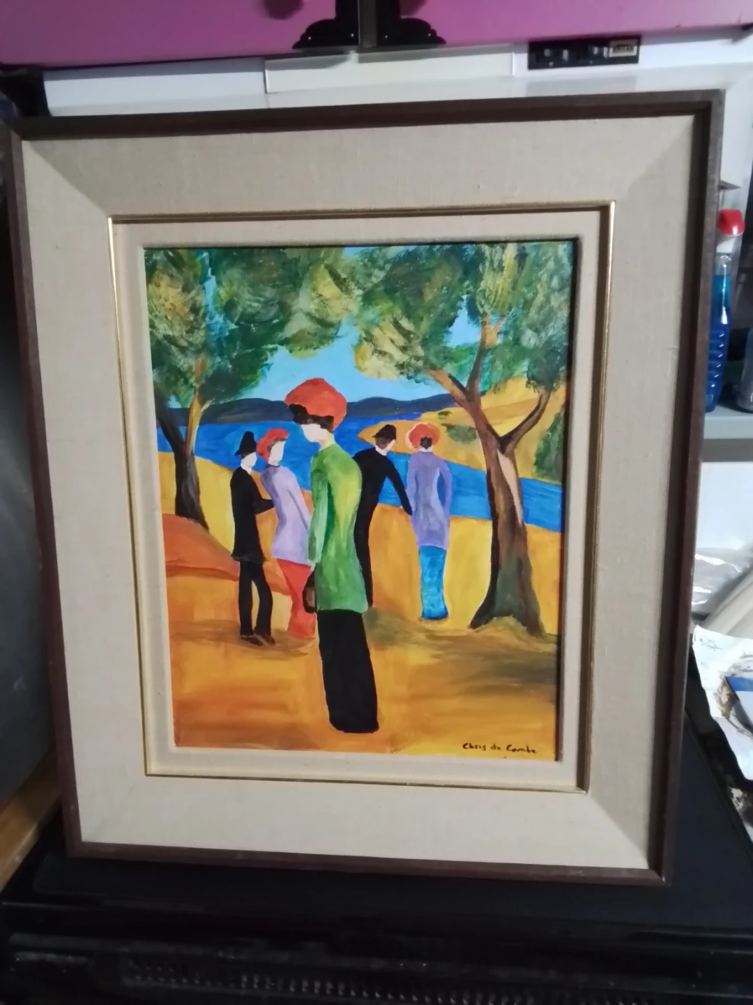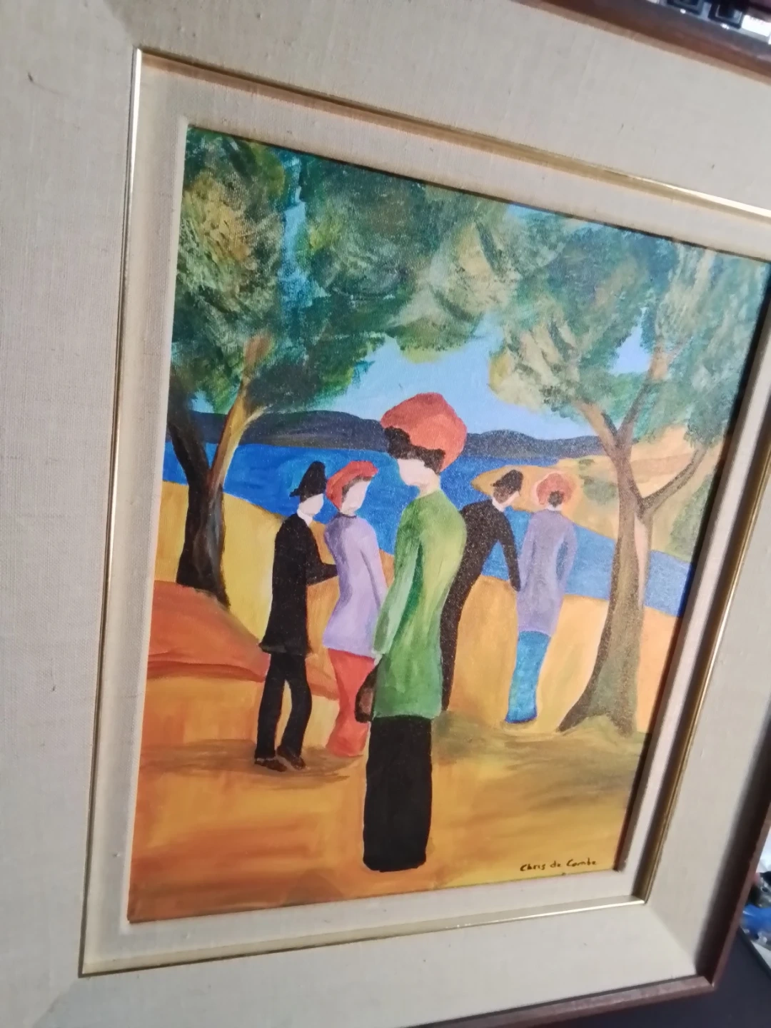 This is a framed painting on canvas by Niagara on the Lake Artist Chris De Combe. The piece features figures in a landscape and is signed by the artist. The condition is good, adding a touch of artistic elegance to any space.