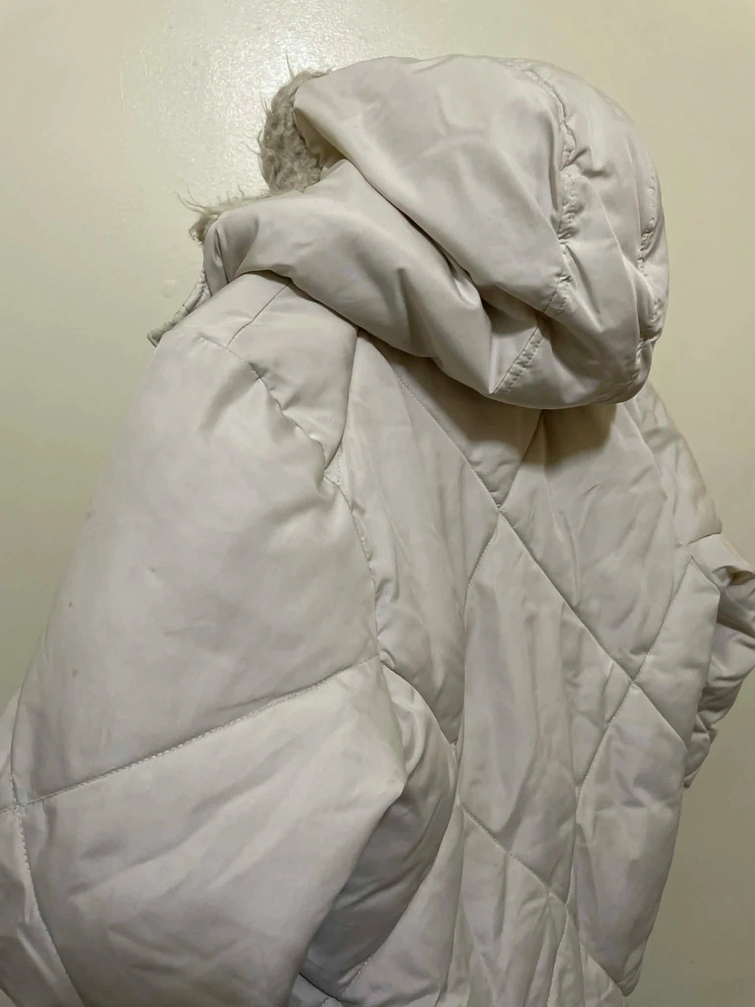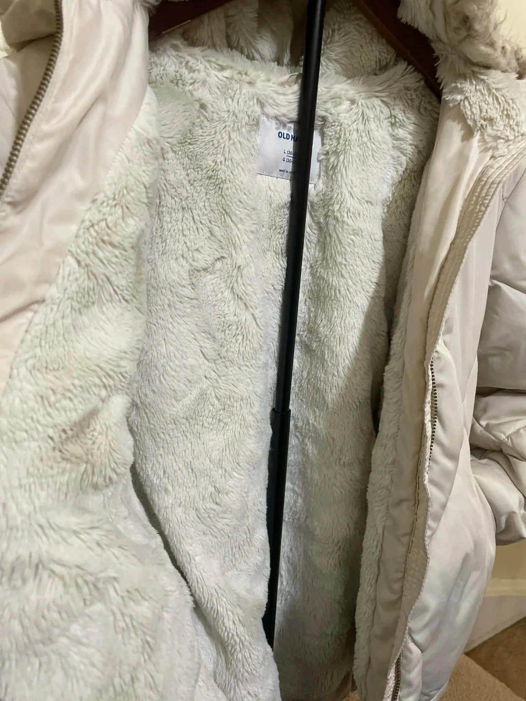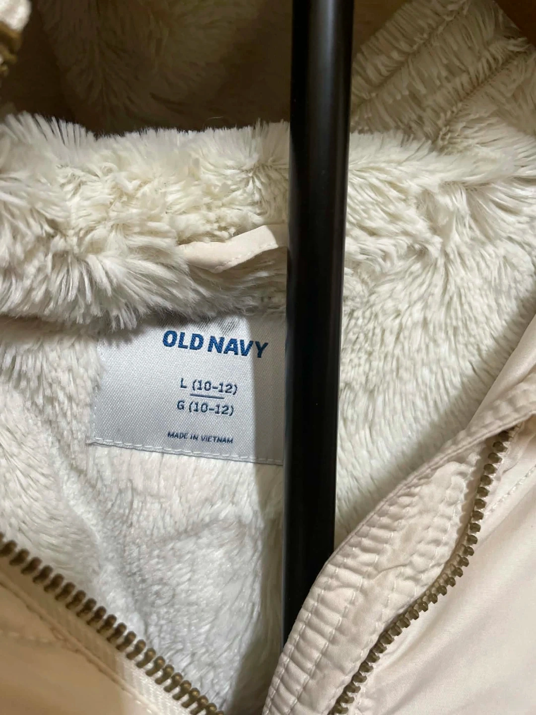 This Old Navy puffer coat is super warm and cozy, with a fluffy Sherpa lining and faux fur trim on the hood. It's a beautiful light beige colour and perfect for chilly weather! The size is L, which corresponds to 10-12 years old.