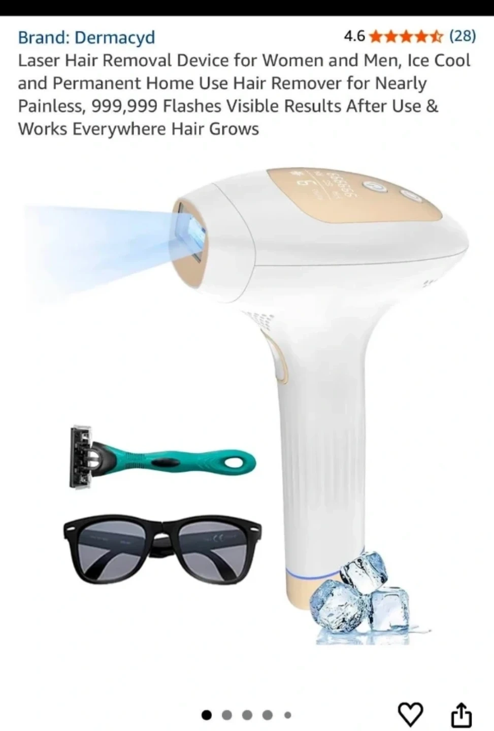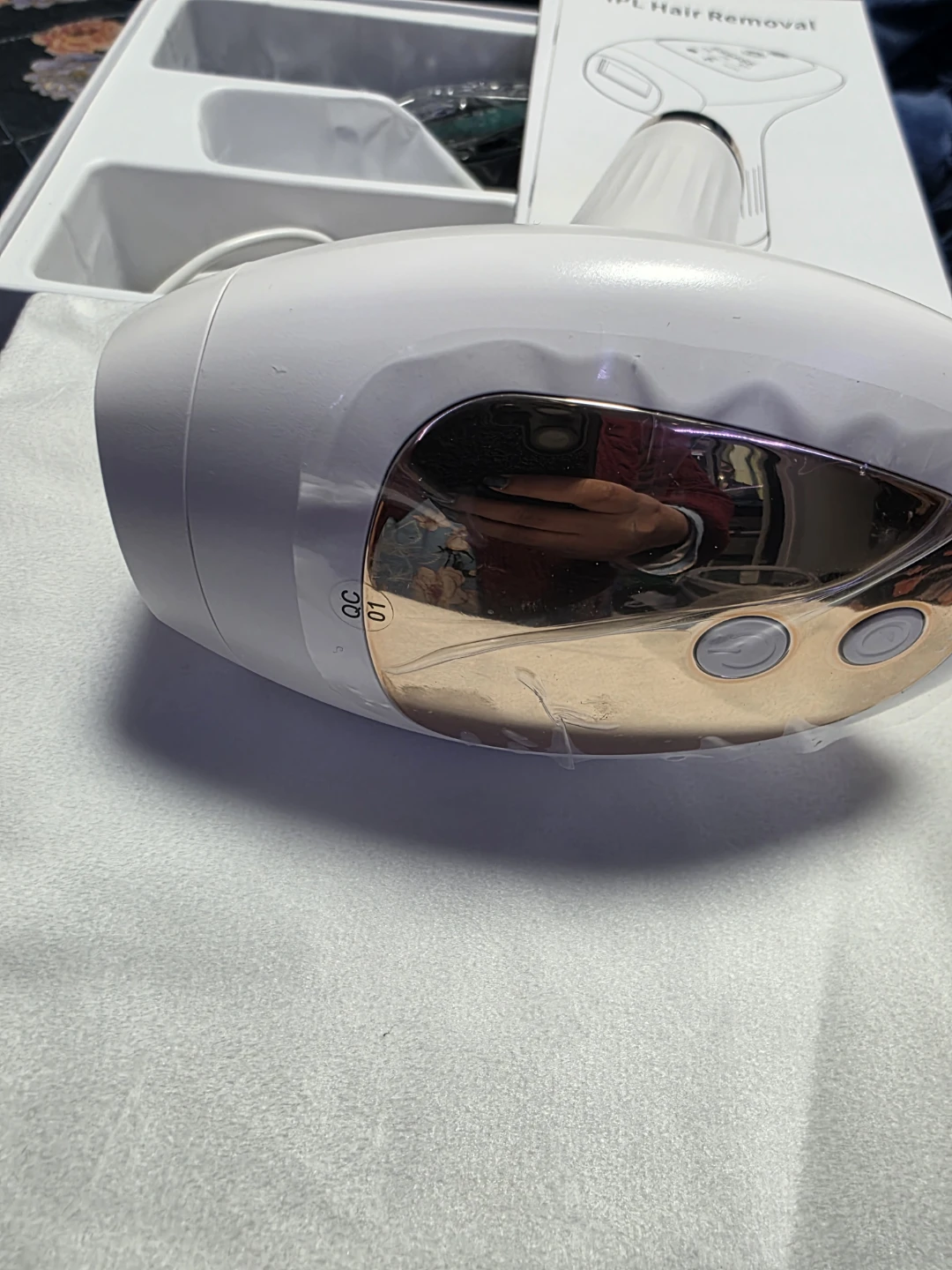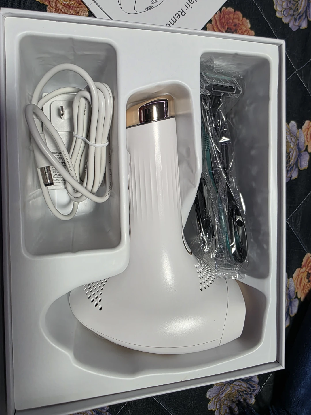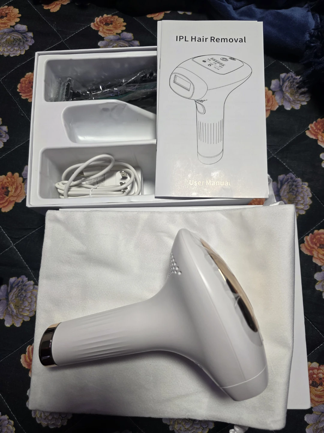 IPL hair removal device. It comes with a power cord, a razor, and a user manual. The device is white with rose gold accents. It's designed for home use.