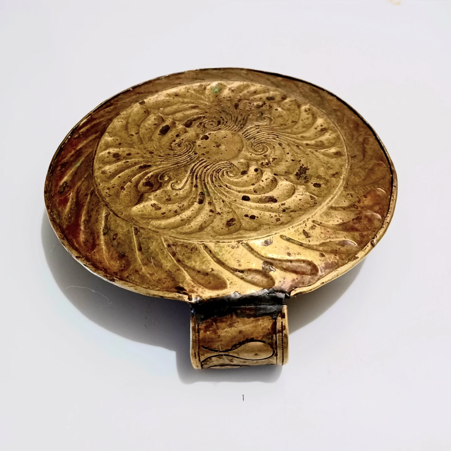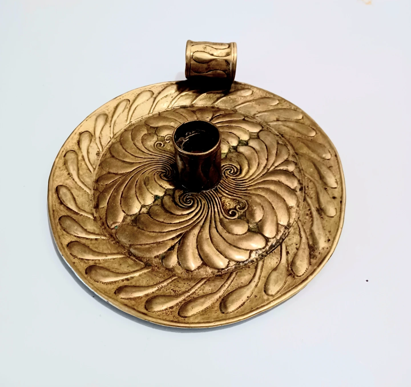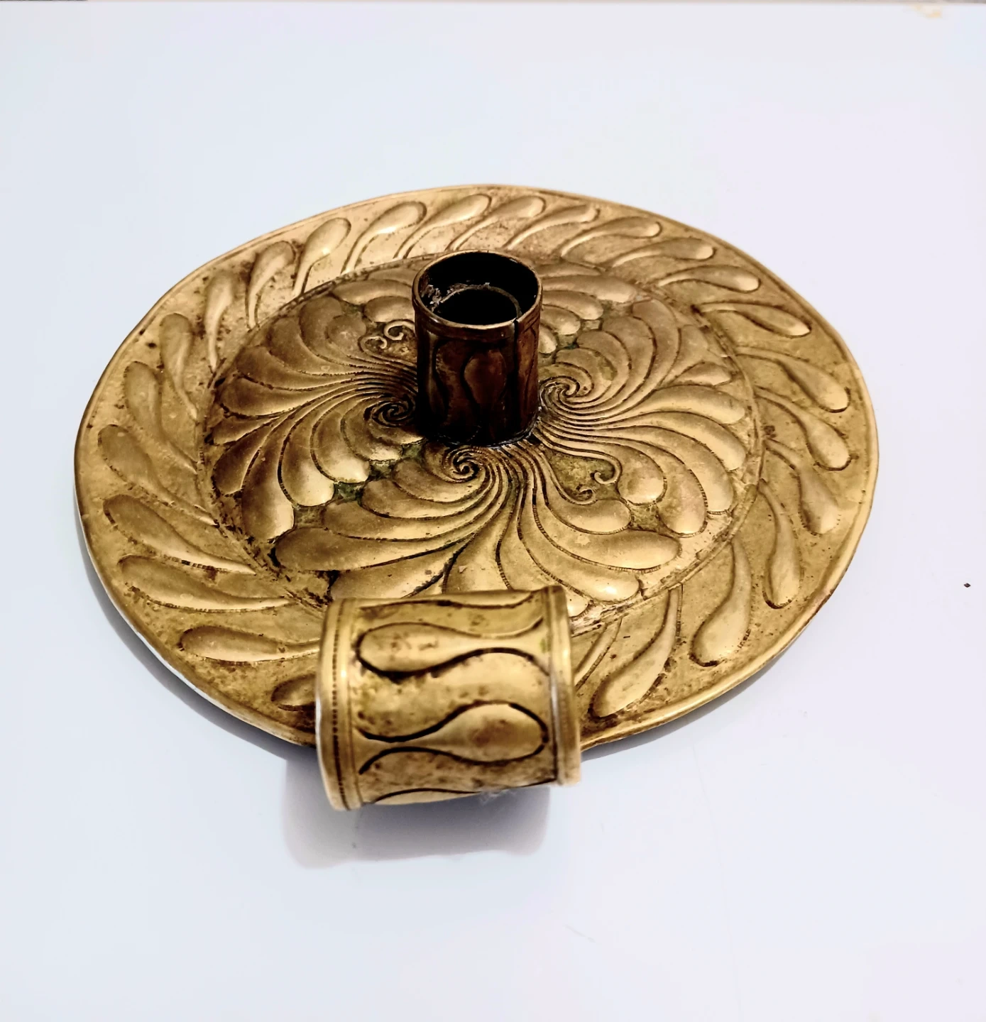 One of a Kind , Antique Hand-beaten Brass Chamber Candlestick (also known as a night stake), characterized by its circular base and a small handle for carrying. Showcasing exquisite Craftsmanship and a unique floral design. Swirling Acanthus leaf or floral decoration.