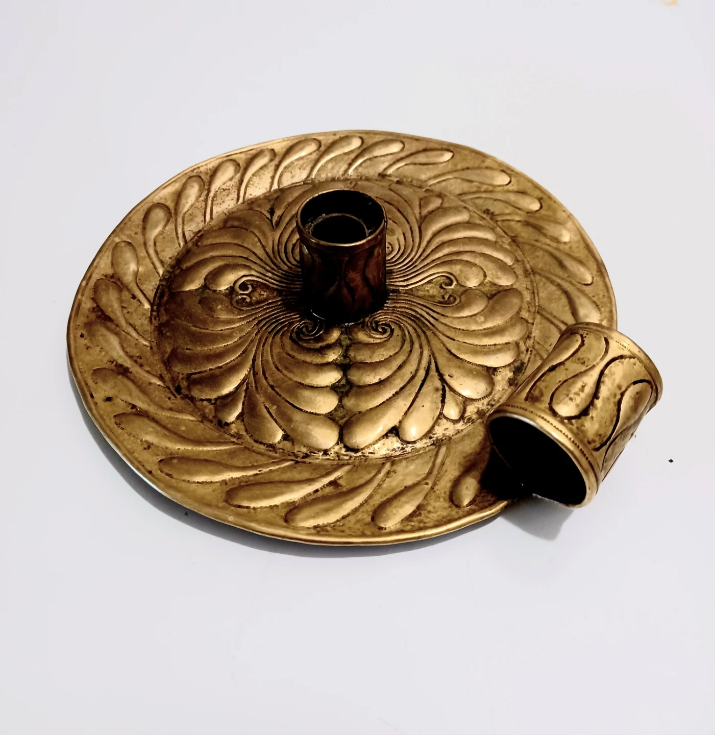 One of a Kind , Antique Hand-beaten Brass Chamber Candlestick (also known as a night stake), characterized by its circular base and a small handle for carrying. Showcasing exquisite Craftsmanship and a unique floral design. Swirling Acanthus leaf or floral decoration.