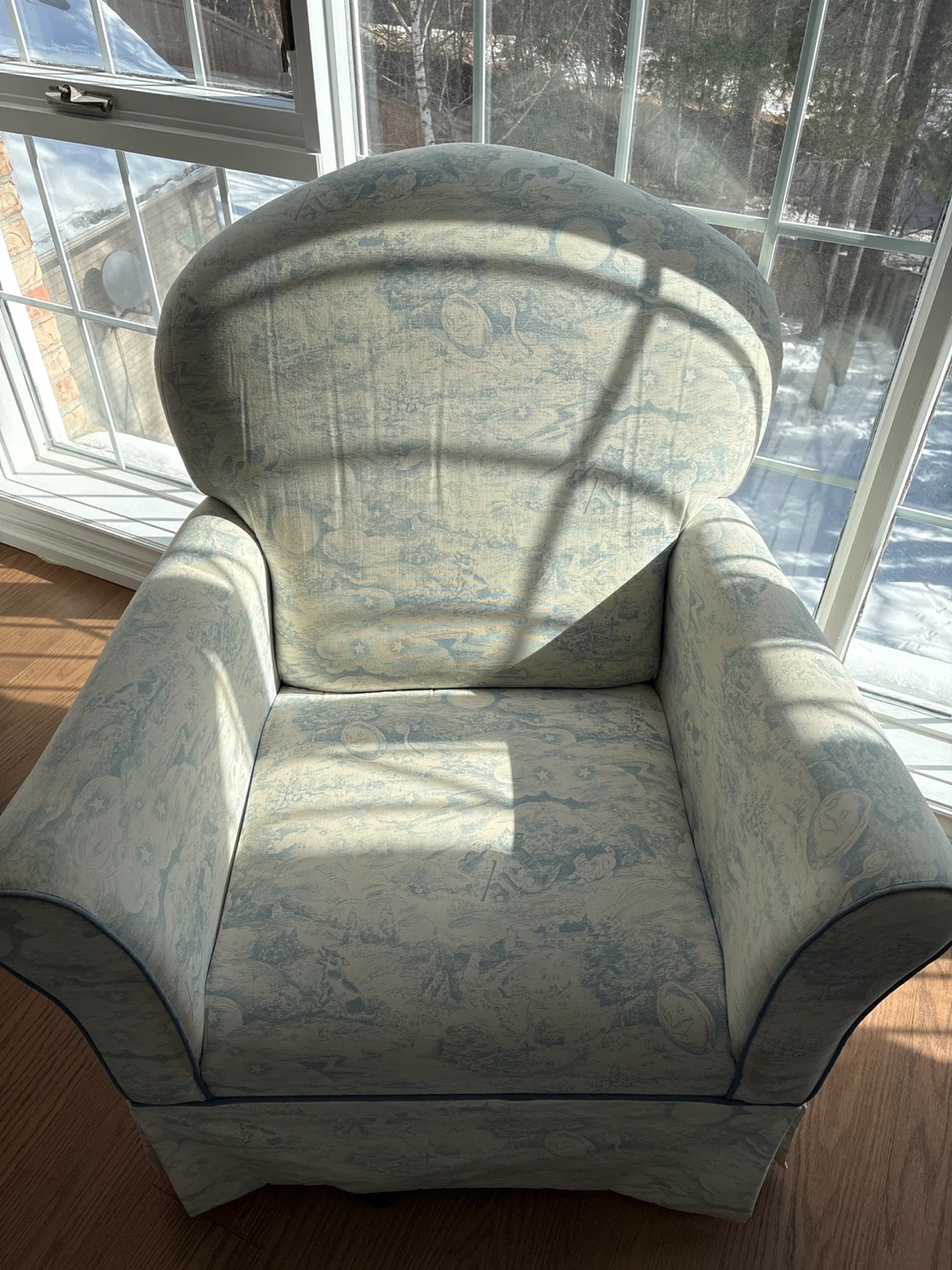 This is a lovely armchair with a matching ottoman. It's upholstered in a charming blue and white toile fabric. The skirted base adds a classic touch.