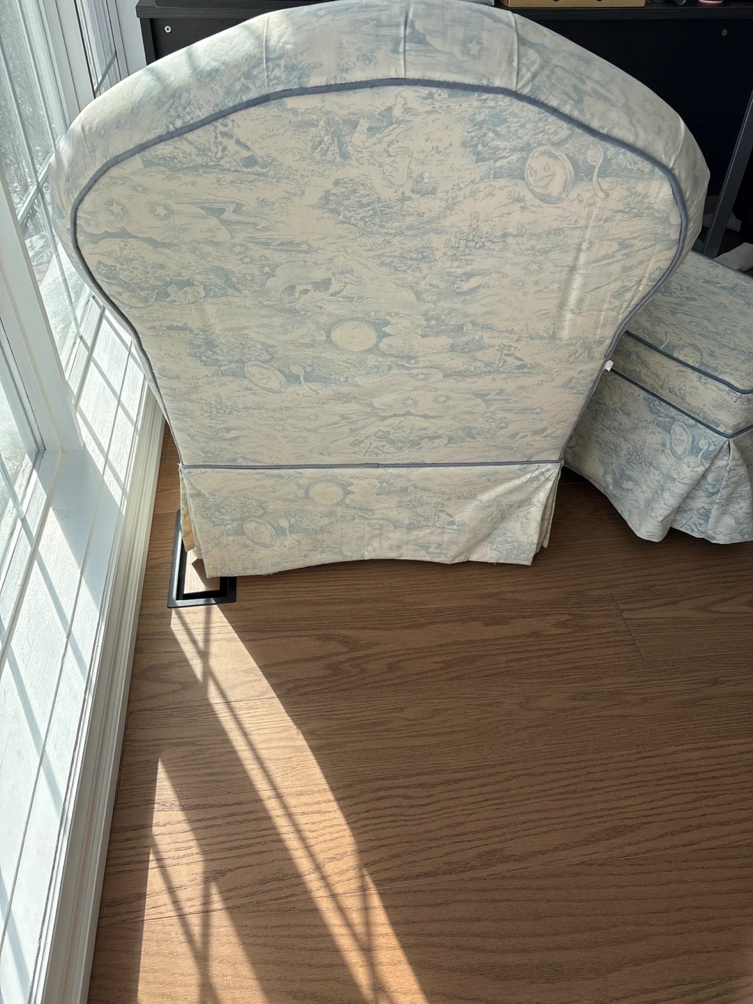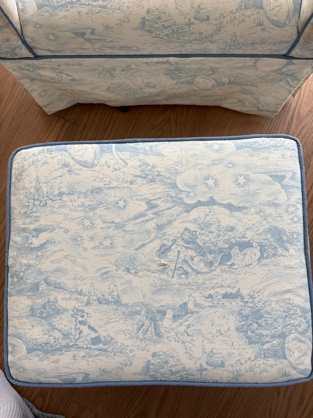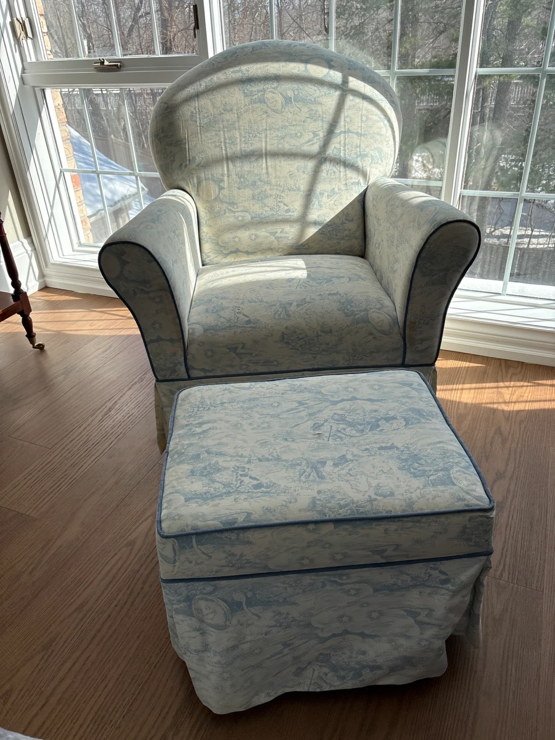 This is a lovely armchair with a matching ottoman. It's upholstered in a charming blue and white toile fabric. The skirted base adds a classic touch.