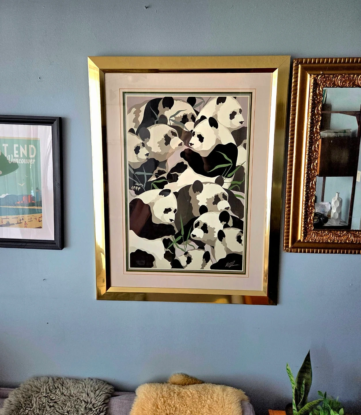 Large retro gold framed collage print of pandas by Tomas Taylor.