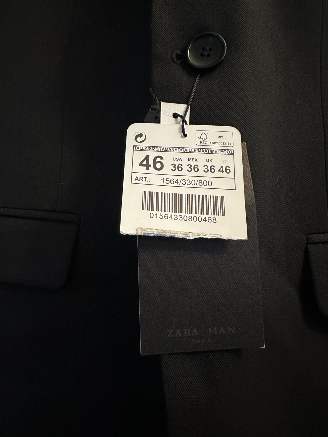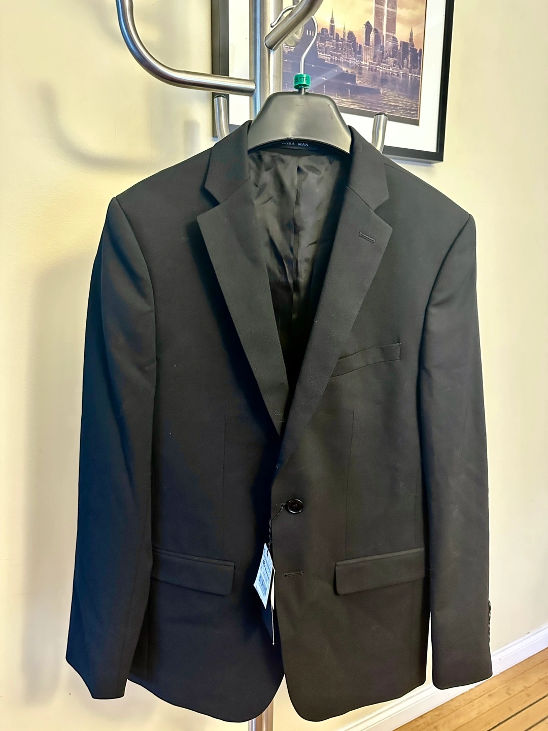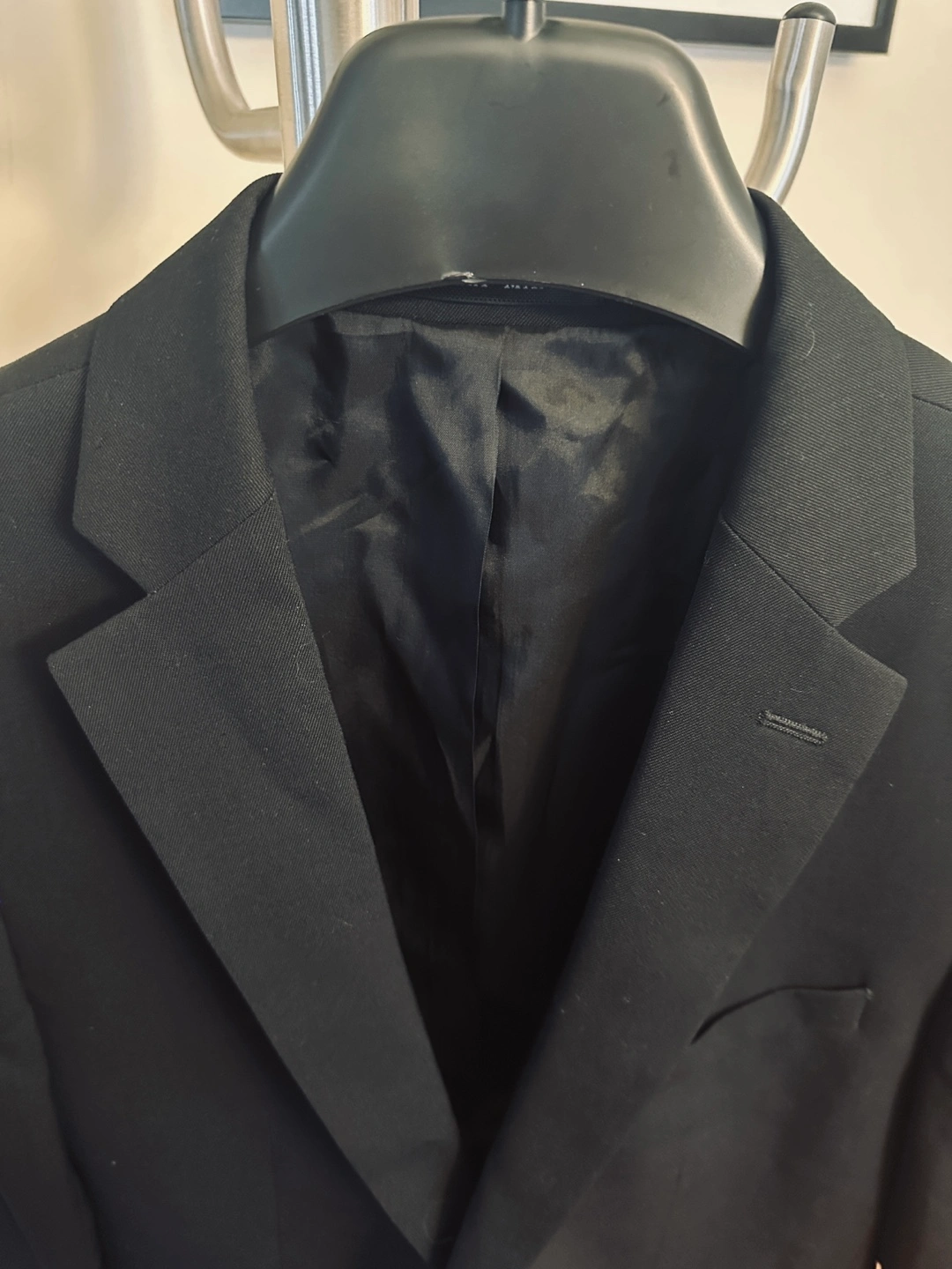 Black blazer with two buttons, two front pockets and one chest pocket. It has a satin lining.