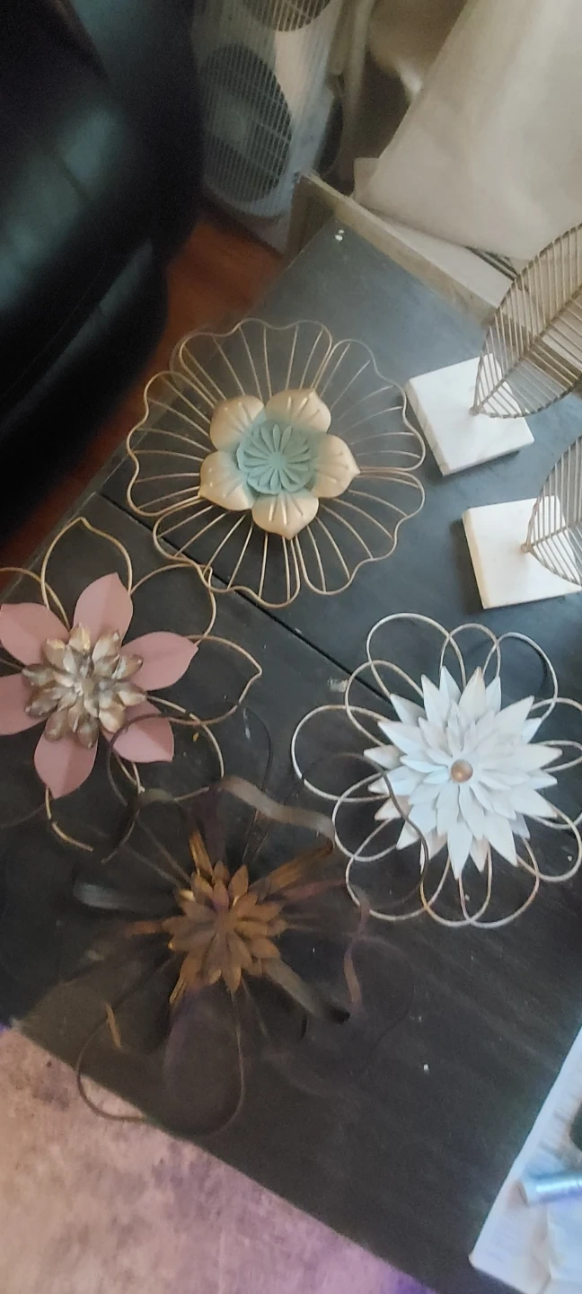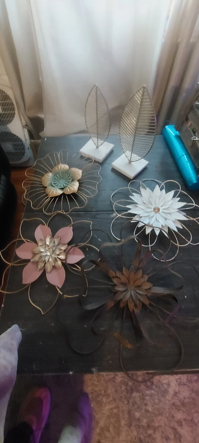 This set includes four decorative metal flower wall art pieces in various colors and two leaf sculptures with marble bases. They're crafted from metal for durability. These decorative items add a touch of elegance to any room!