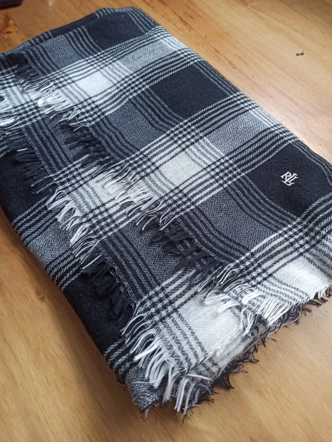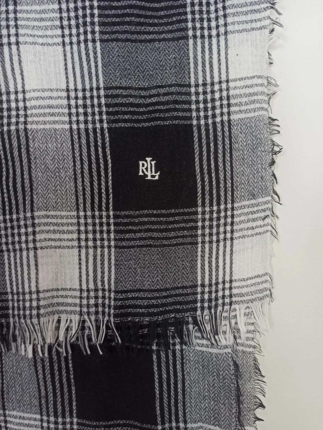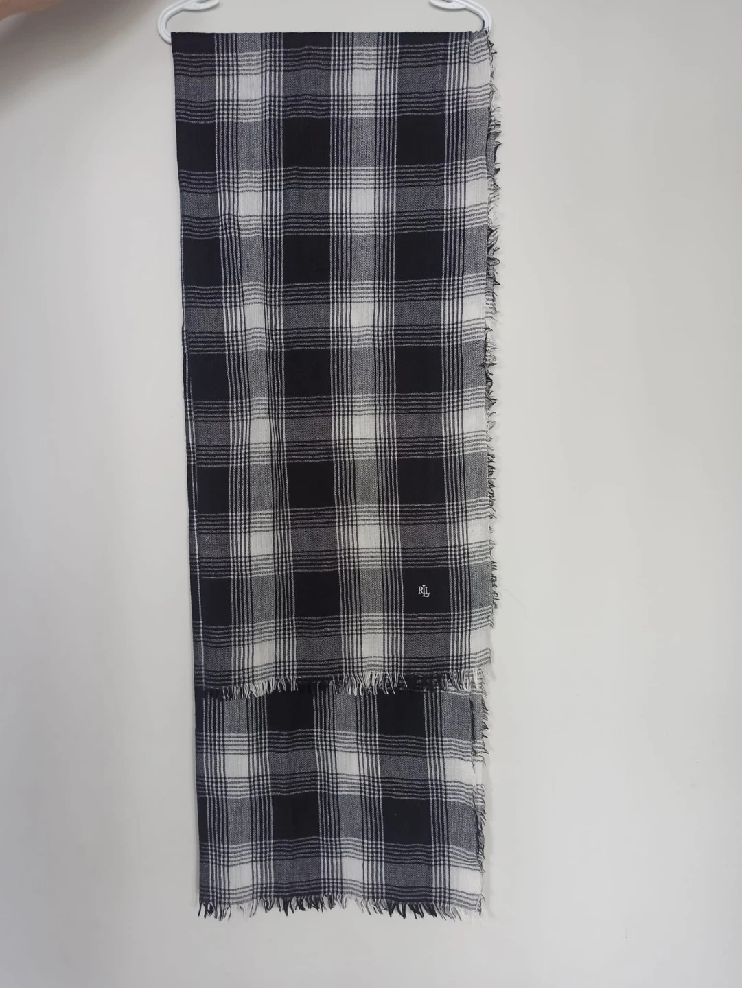 A Ralph Lauren scarf with a classic black and white plaid pattern. It's finished with fringed edges for a touch of style. Perfect for adding warmth and a touch of sophistication to any outfit! Pick up in East Village
