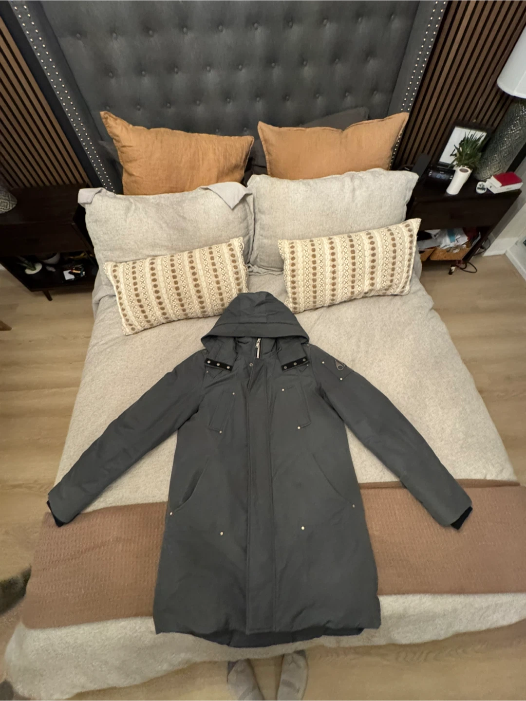 Selling a Moose Knuckles down parka in size L/G. The tag says "Cloud 9: Rise Above the Cold" and mentions it is wind resistant, water repellent & breathable, and durable weather resistant aux & trims. It's a stylish and warm coat for those cold Canadian winters!