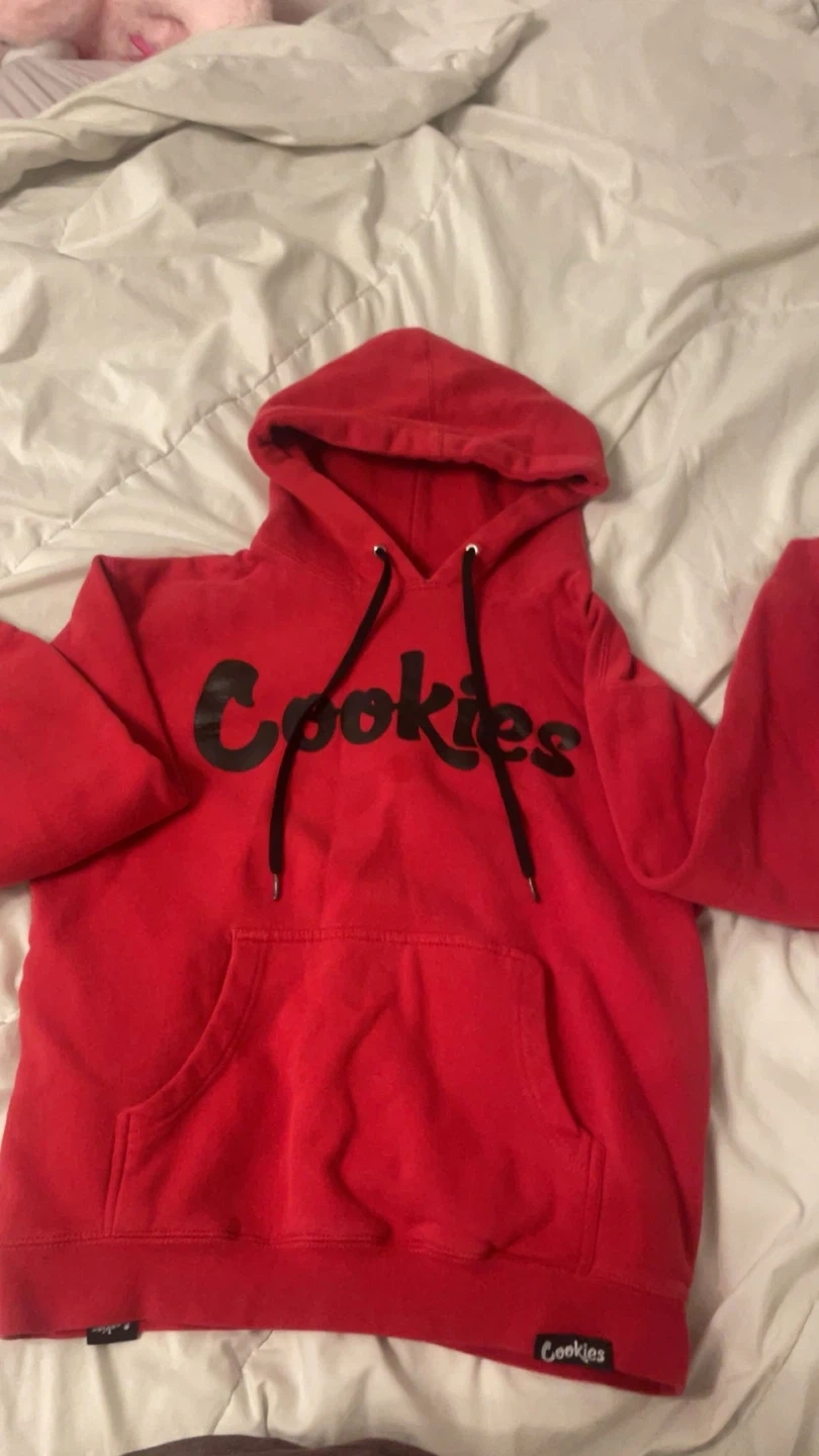 This is a red Cookies hoodie with black lettering. It's a pullover style with a front pocket and hood. Made with comfortable fabric.