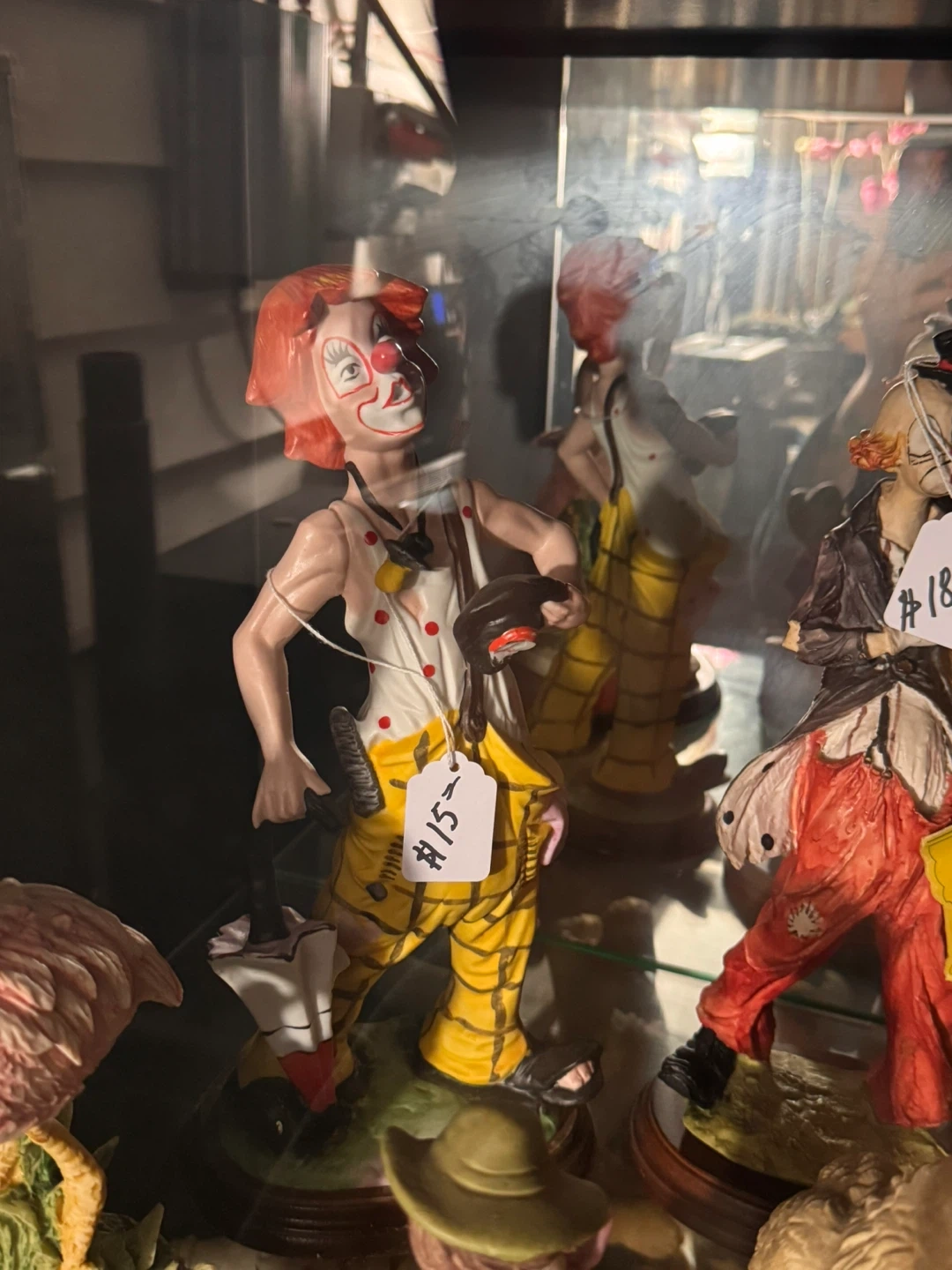 This is a vintage clown figurine. It's wearing a yellow, checkered jumpsuit with red polka dots. The figurine comes with a black hat and a closed umbrella. It's part of a collection.