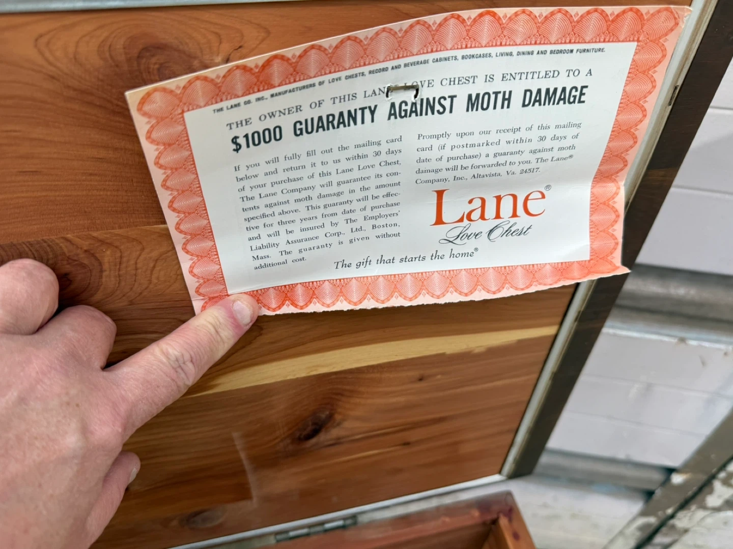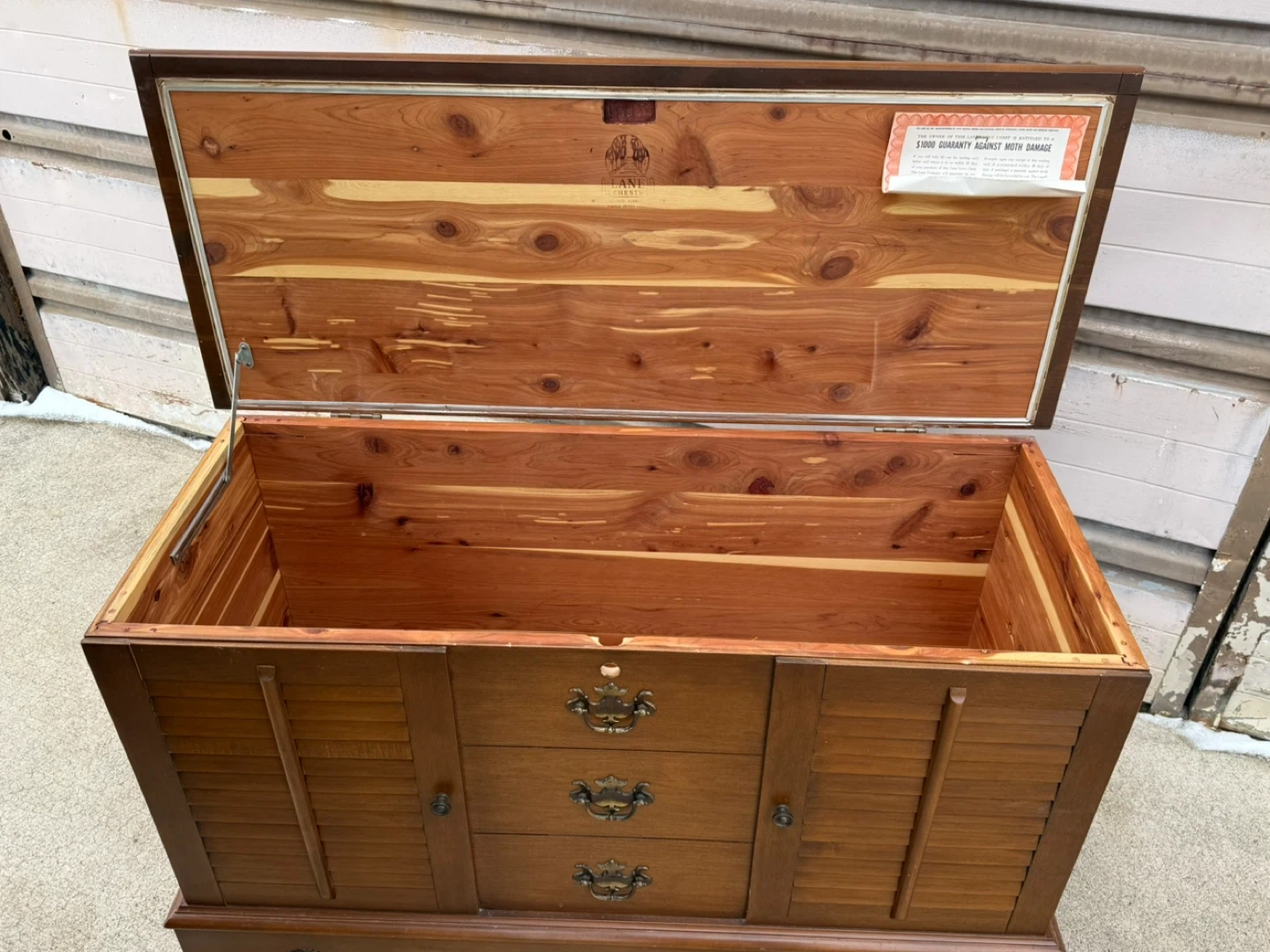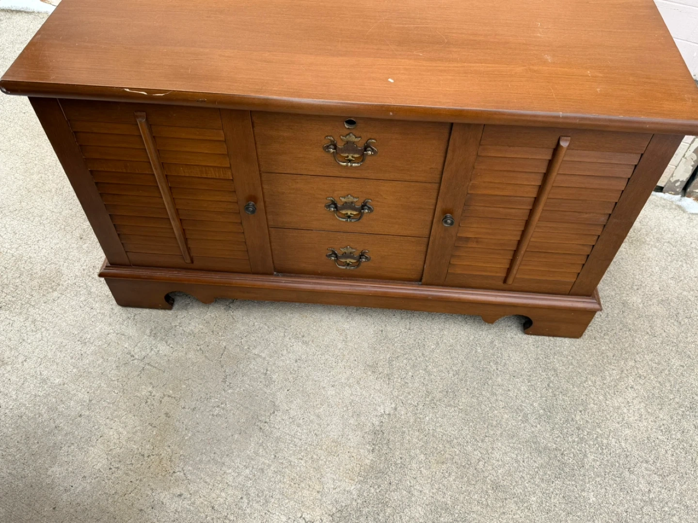 Vintage cedar lined blanket chest with three drawers. Interior lined with aromatic cedar. Measures approximately 41 inches wide and 19 inches high. Perfect for storing blankets or linens!