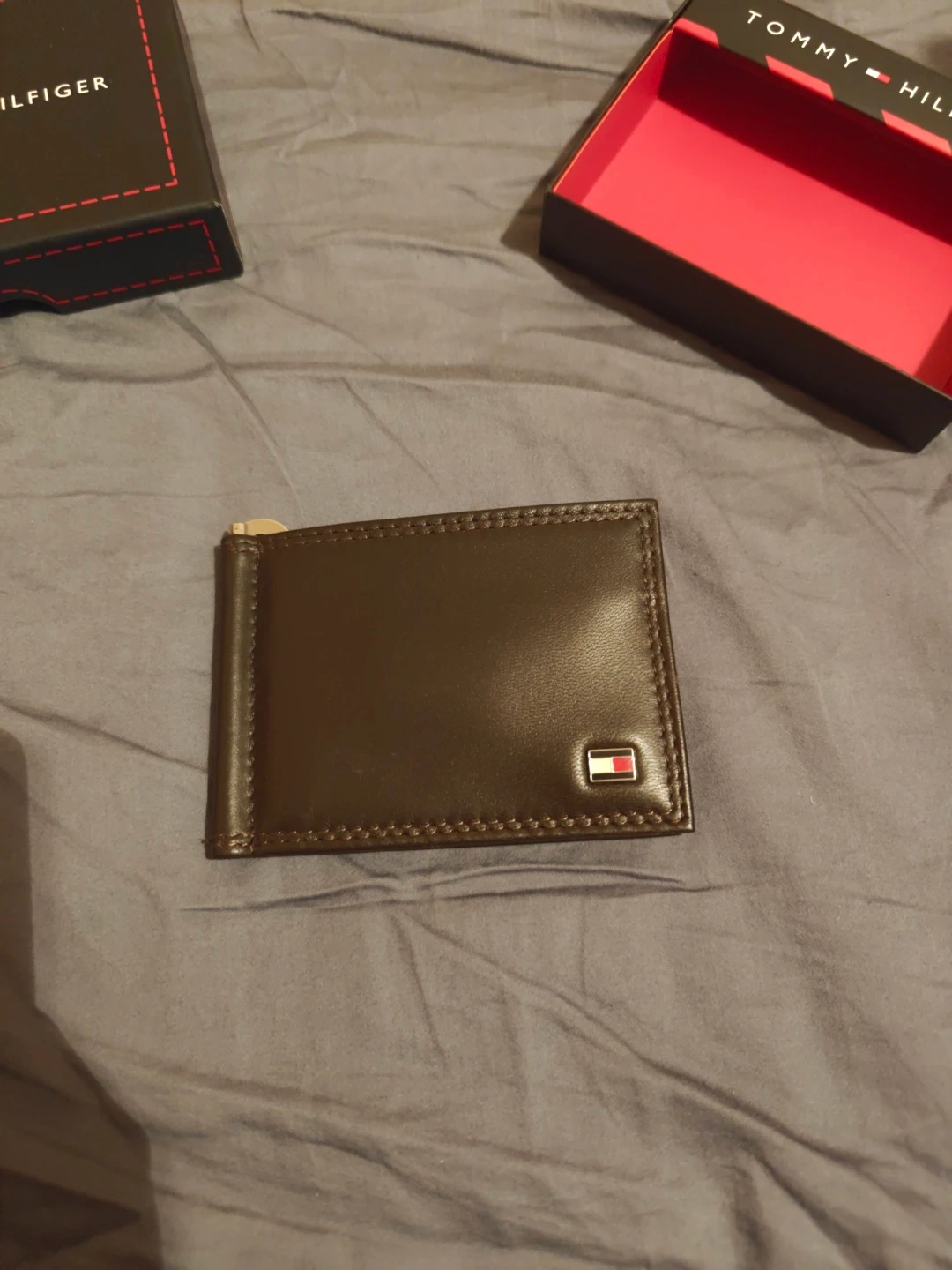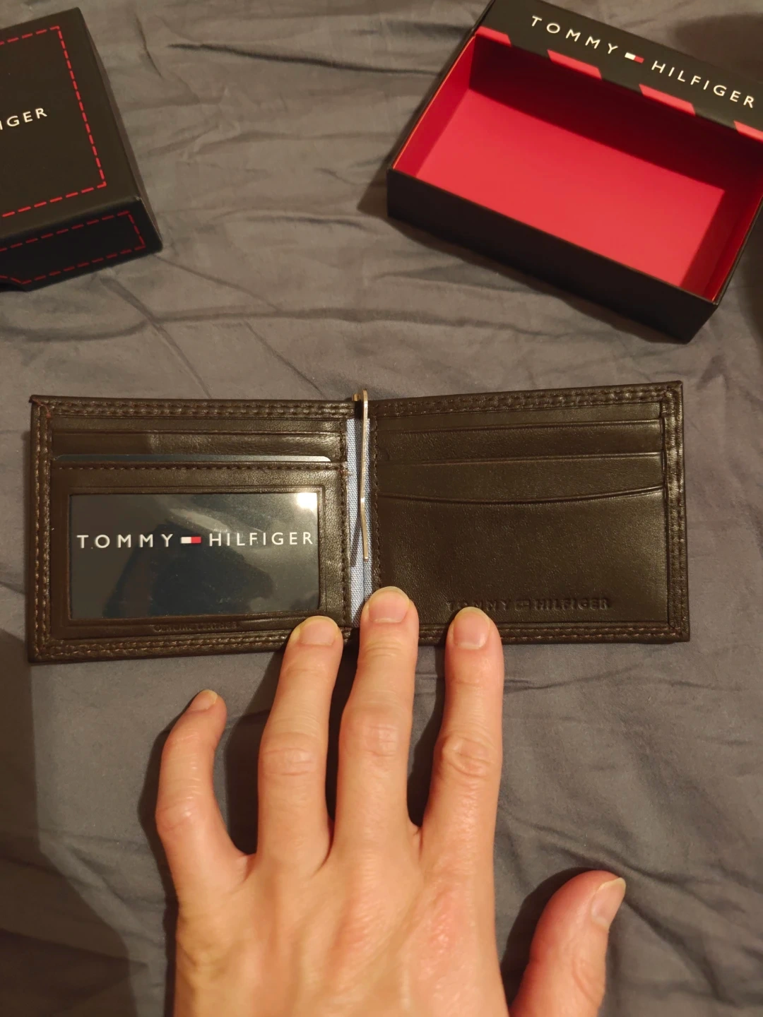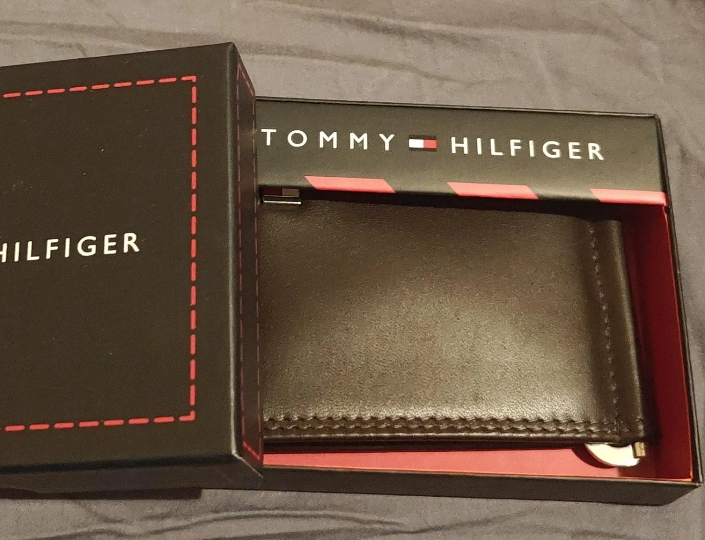 This is a Tommy Hilfiger men's leather money clip wallet. It's brown and comes with the original box. Plenty of card slots are available inside.