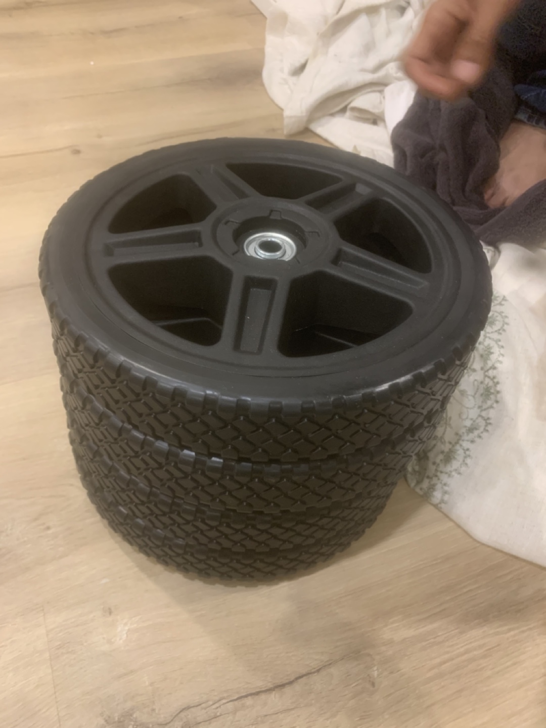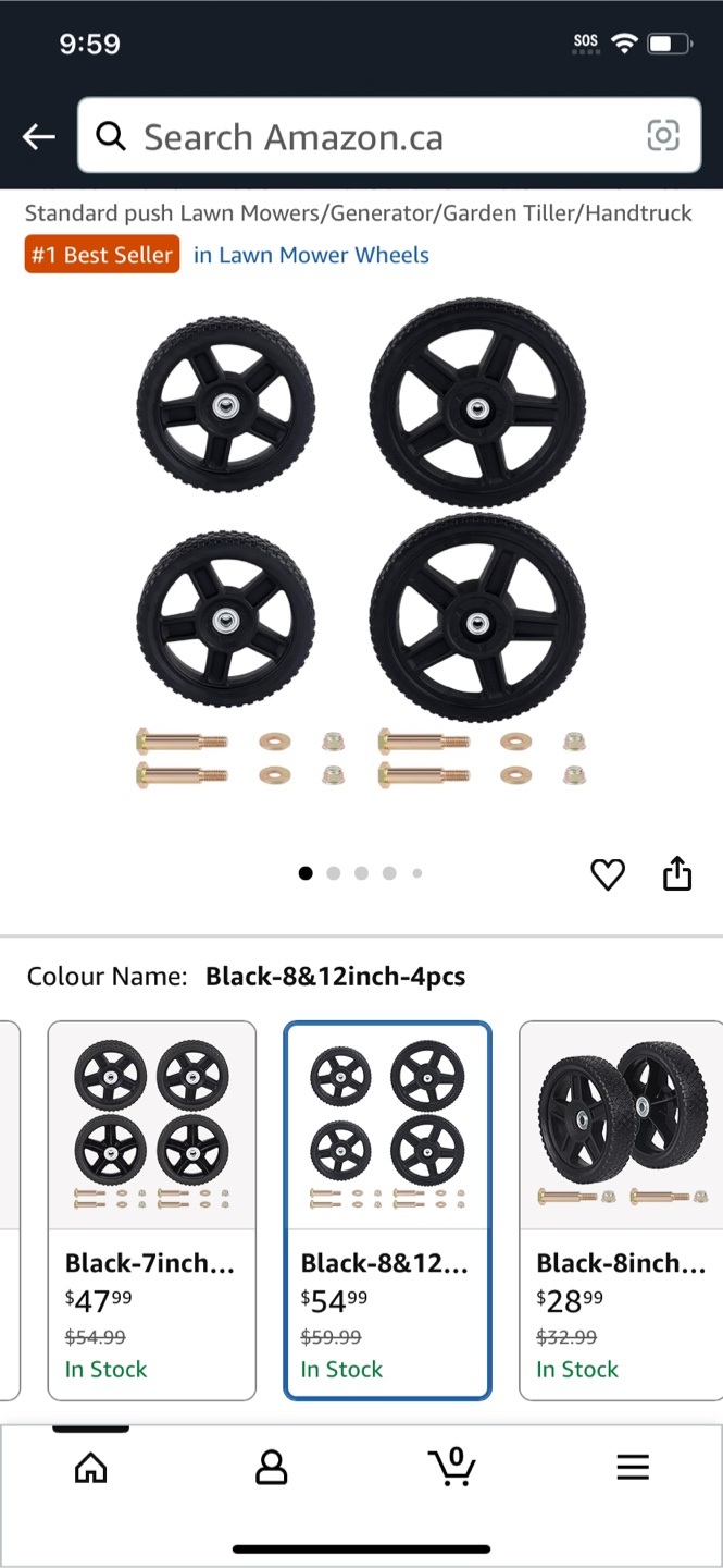 Selling a set of lawn mower wheels. They are black and come in a set of 4 pieces, sized at 8 and 12 inches