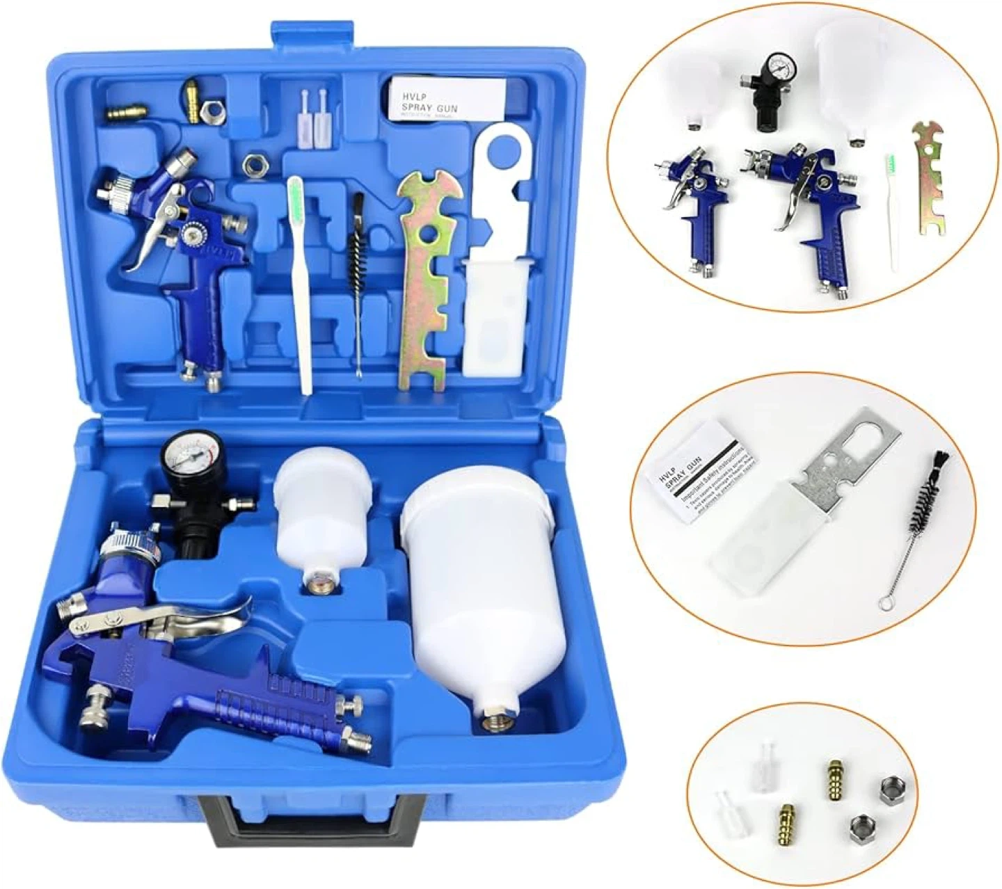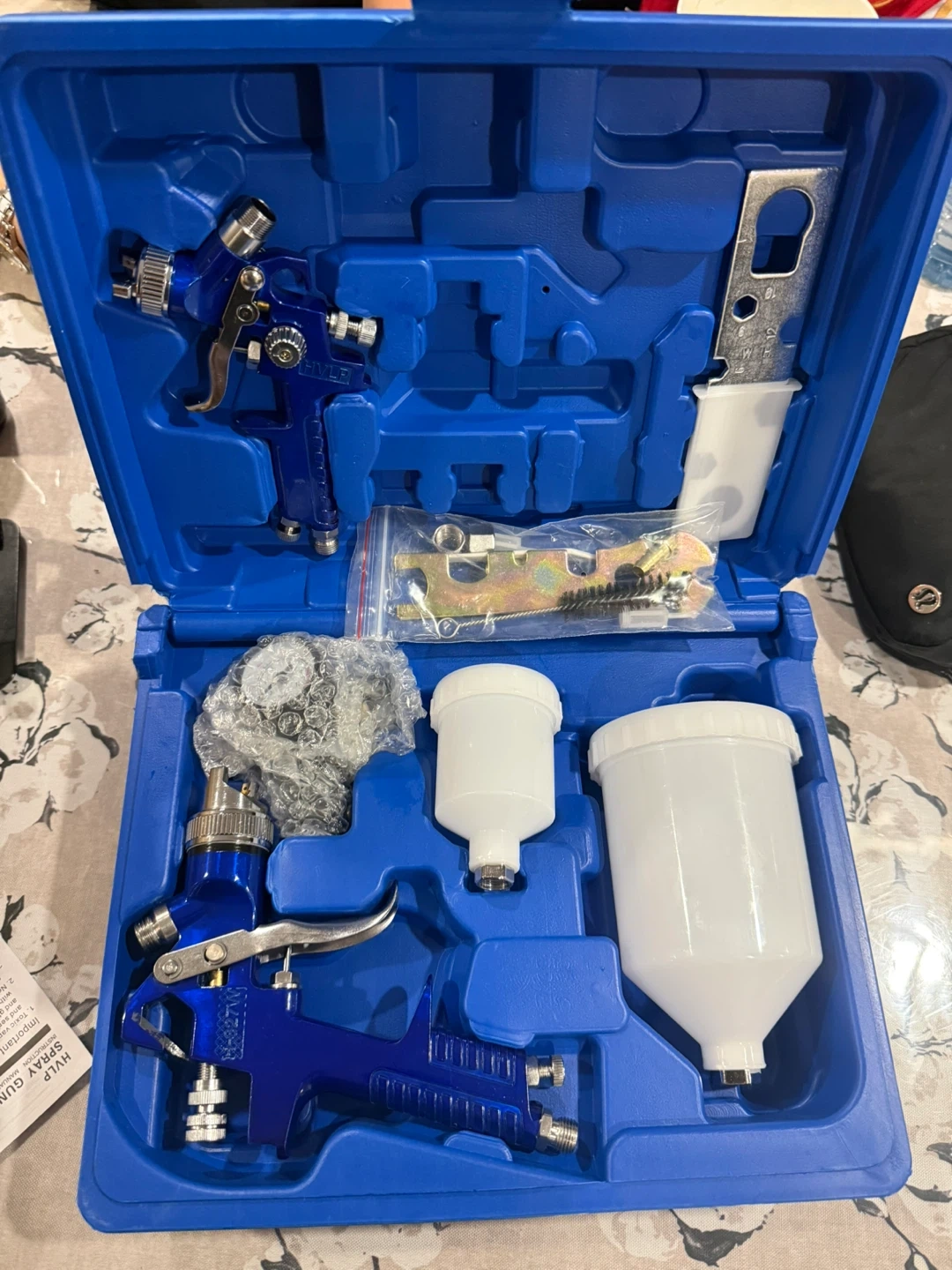 43Selling a complete HVLP air gravity spray gun set. It includes: - 1 x HVLP Spray Gun with 0.8mm Fluid Tip - 1 x HVLP Spray Gun with 1.4mm Fluid Tip - 1 x 600ml Nylon Cup with Lid - 1 x 125ml Plastic Cup with Lid - 1 x Brush Cleaning Kit - 2 x Spanner wrenches - 1 x Locking Air Pressure Regulator - 1 x Blue Carrying Box This set is brand new and comes in a blue carrying box