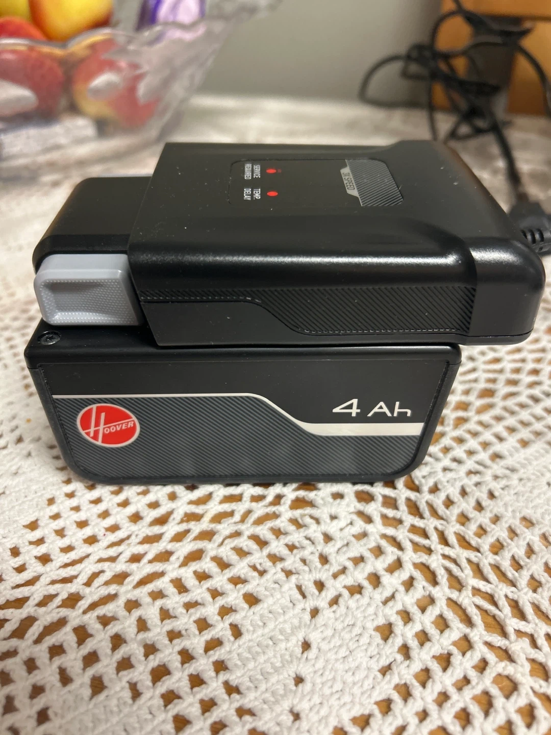 This is a Hoover ONEPWR 20V Lithium-Ion battery. It's a 4.0 Ah capacity battery, providing 72.0 Wh of power. The charger and battery pack are included.