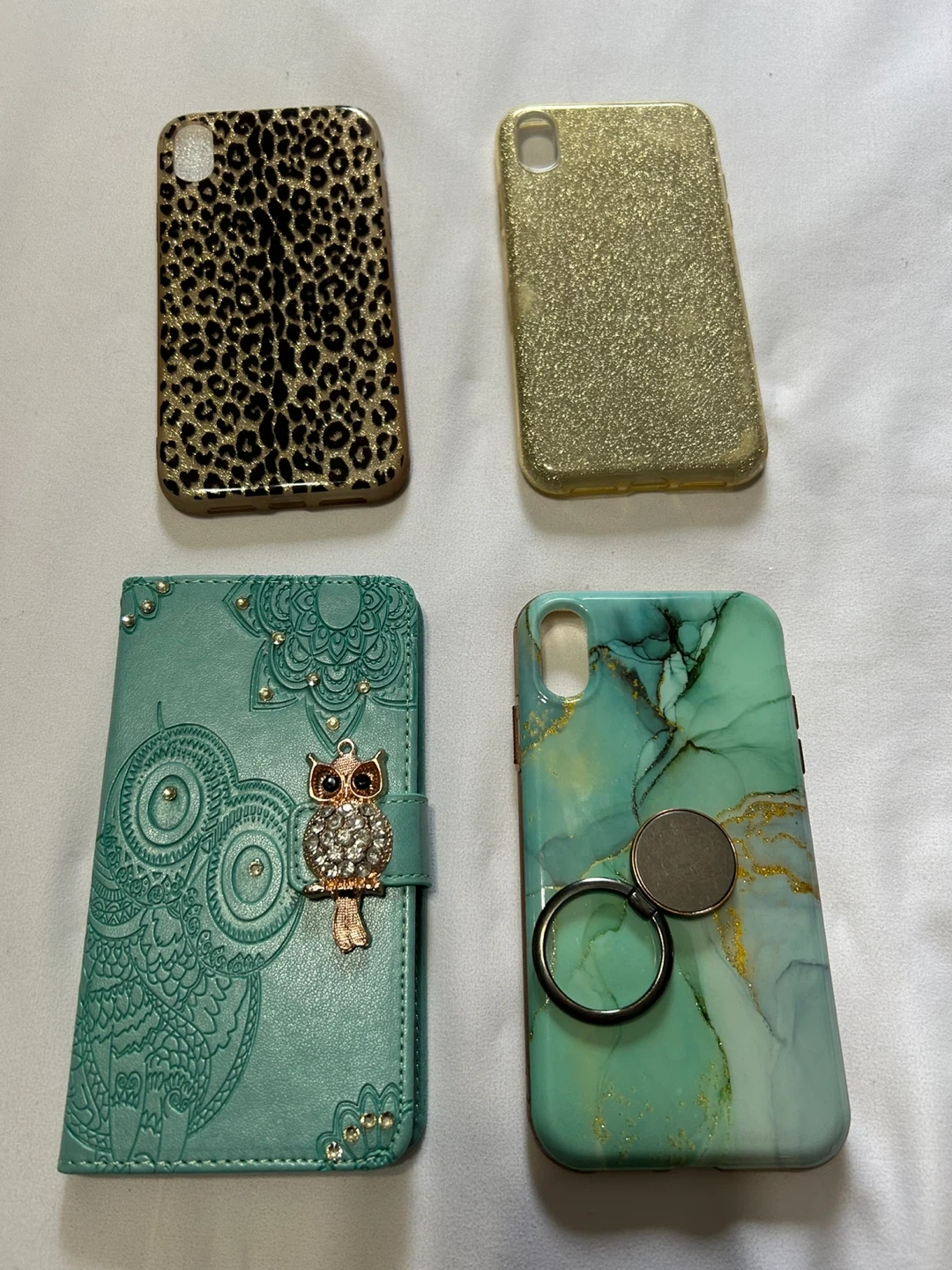Selling a set of four iPhone XS cases. They're in great shape and ready for a new phone! There's a variety of styles to choose from, including a cute owl design and a cool marble pattern