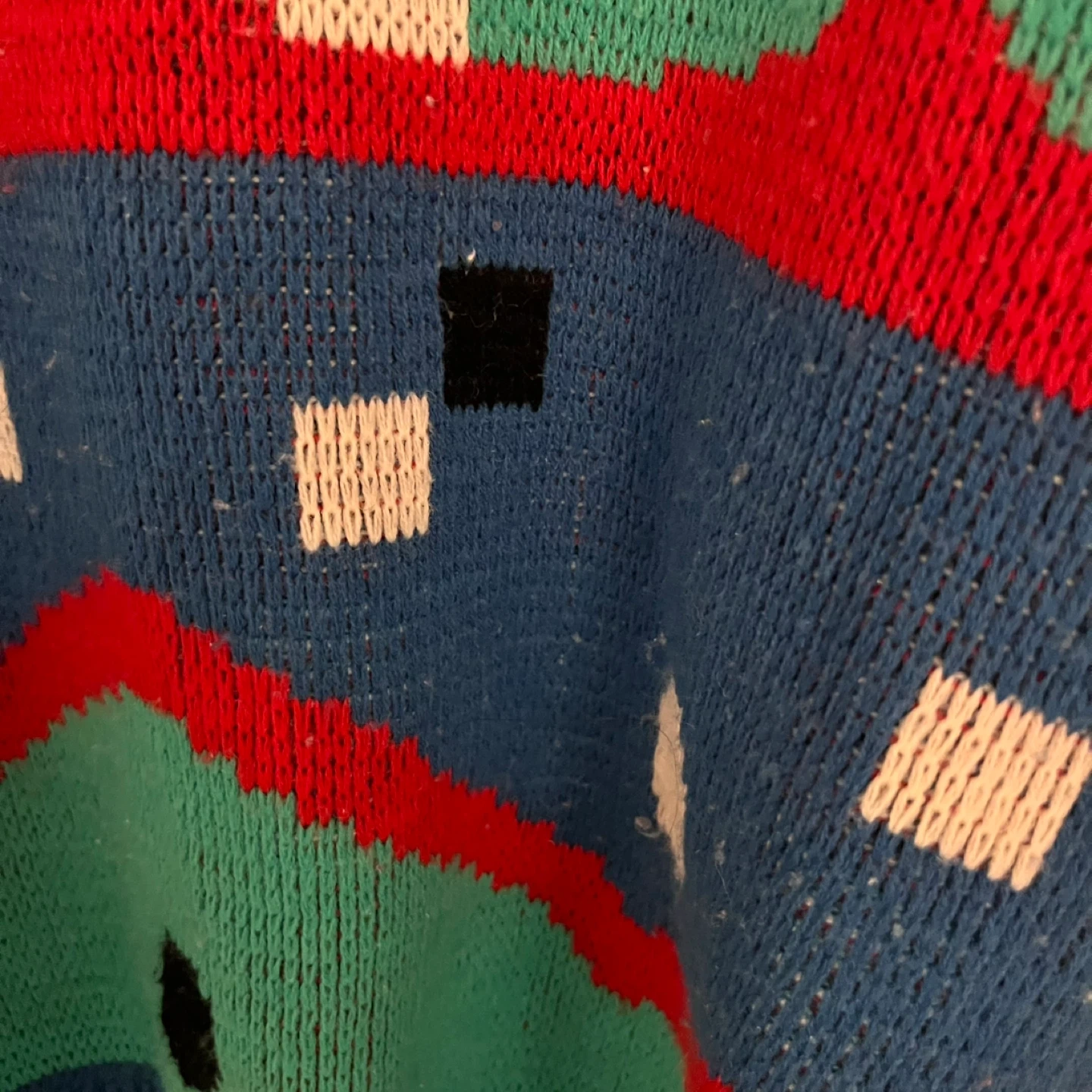 Super funky, great condition and very warm. It has a slight lantern sleeve and some very mild pilling. Perfectly fine to wash but lay flat to dry.