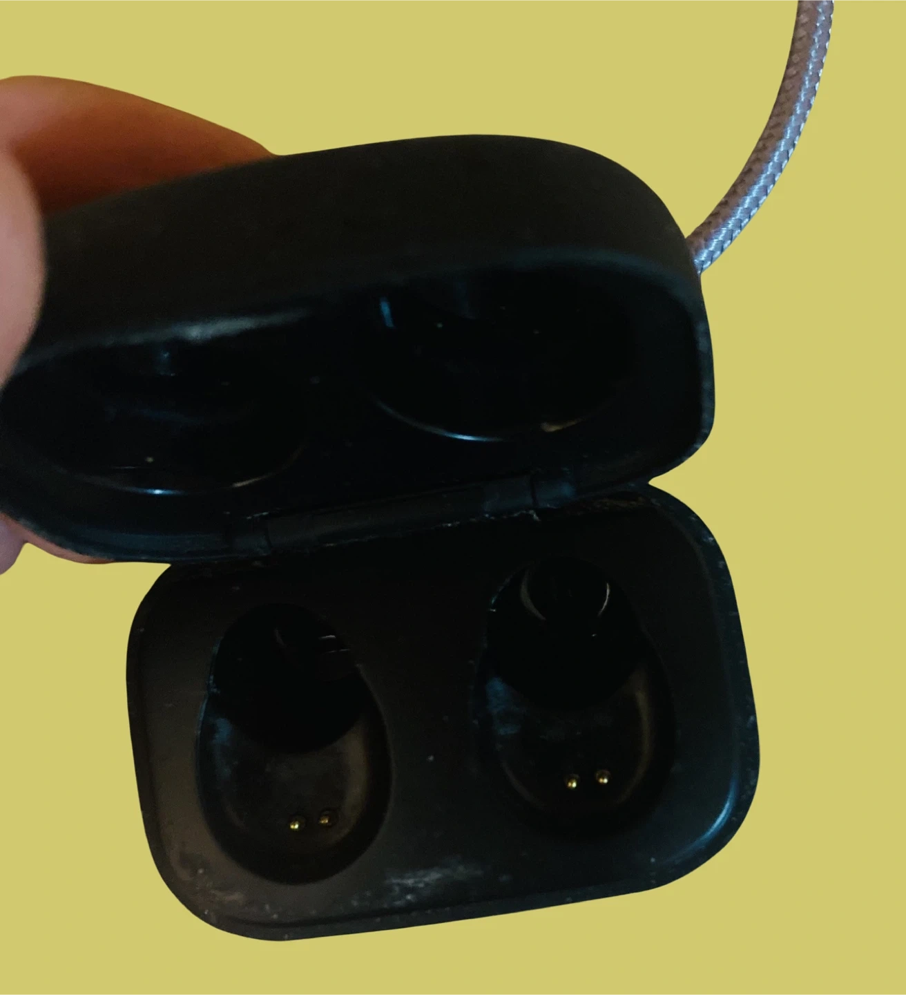 This is an Abramtek charging case for true wireless earbuds. It's black with a silver charging cable loop. The case opens to reveal two earbud slots with charging pins. Blue indicator lights are visible on the front.