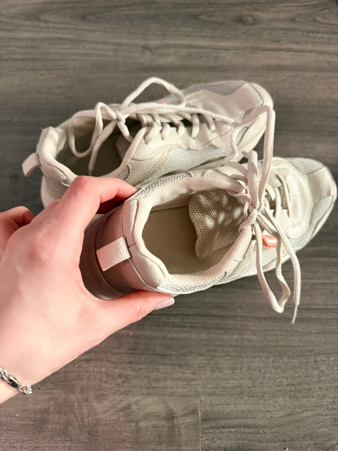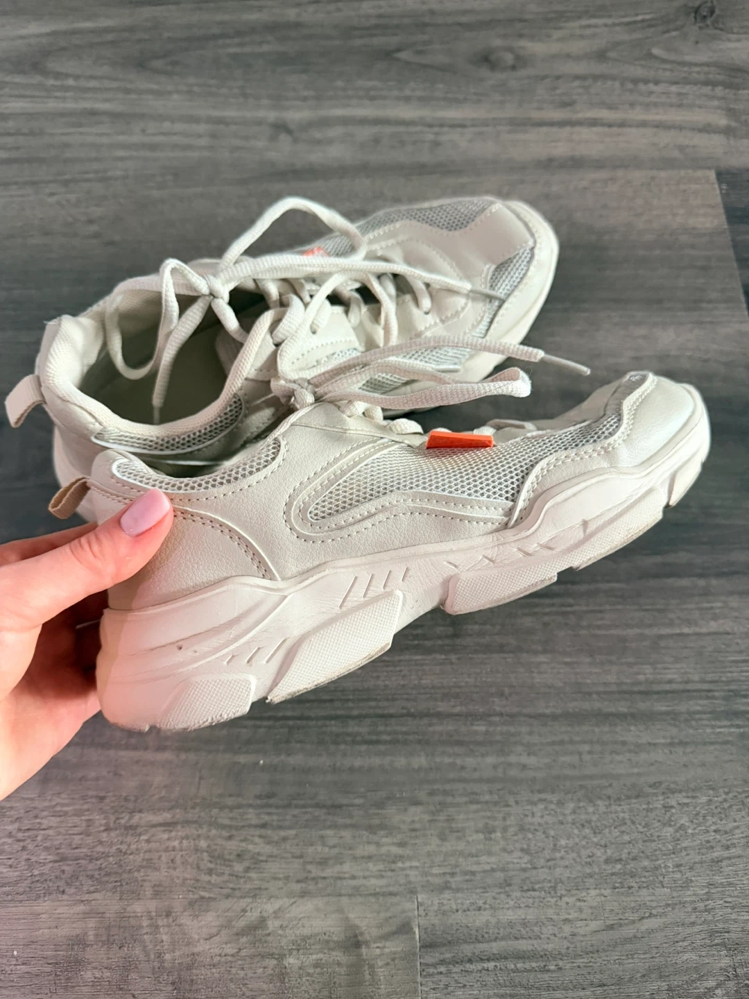 These light grey sneakers are made with a mesh and synthetic material. They feature a durable rubber sole for traction. Perfect for casual wear or light activities!