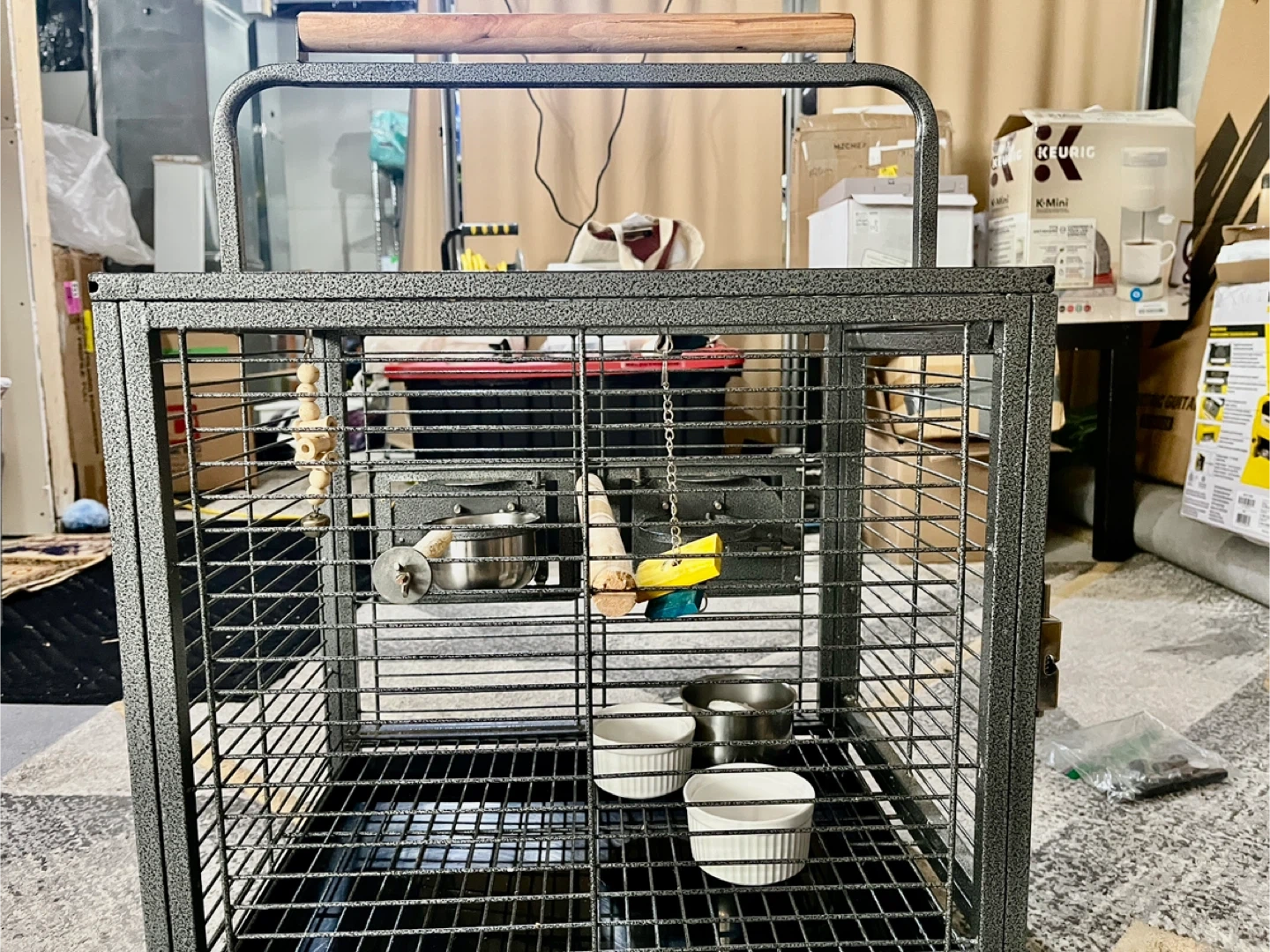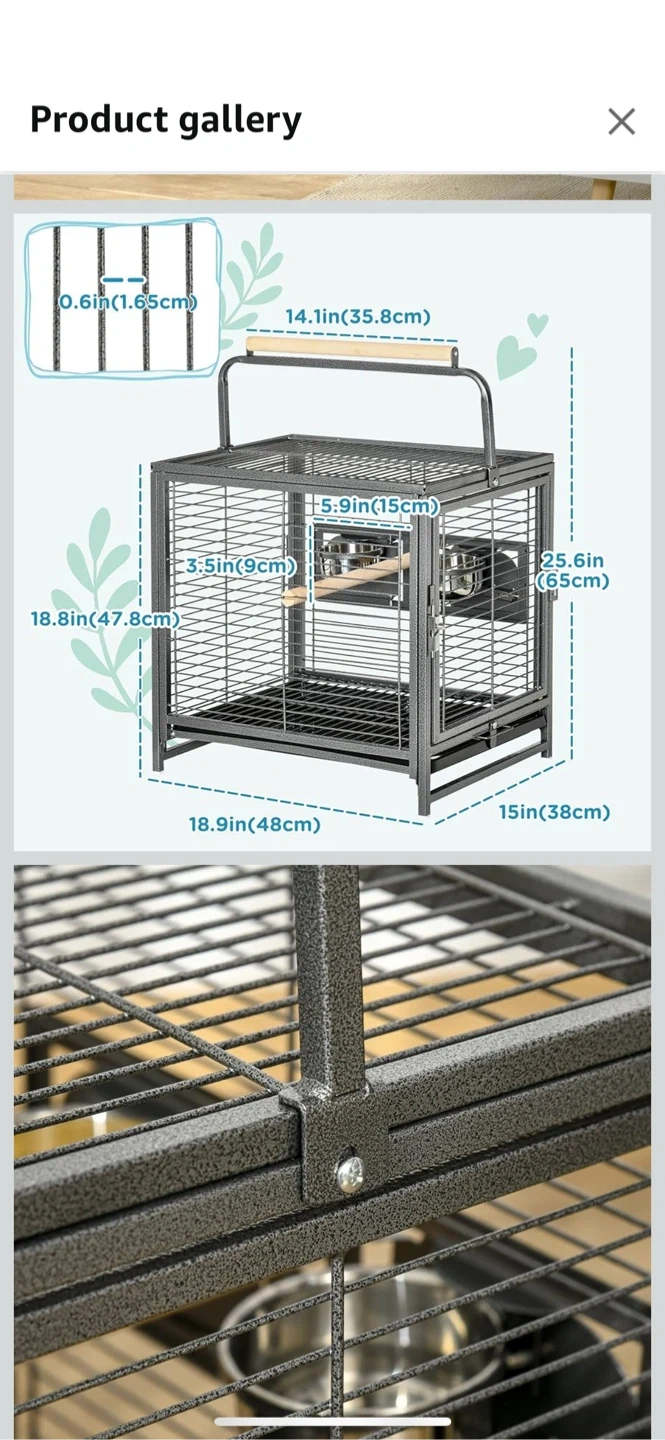 Selling a metal bird cage that's perfect for your feathered friends! It comes with stainless steel bowls and a wood perch for them to enjoy. The cage features multiple doors for easy feeding and access, plus a safety lock for peace of mind. It also has foot pads to protect your floors. Dimensions are approximately 18.9" x 15" x 25.6".