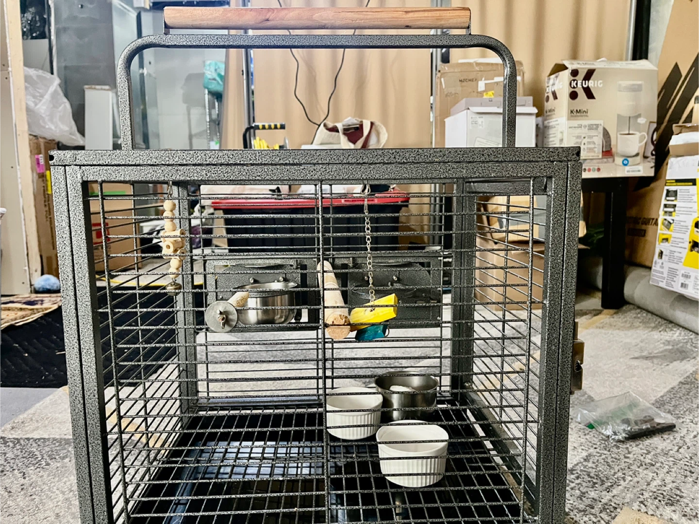 Selling a metal bird cage that's perfect for your feathered friends! It comes with stainless steel bowls and a wood perch for them to enjoy. The cage features multiple doors for easy feeding and access, plus a safety lock for peace of mind. It also has foot pads to protect your floors. Dimensions are approximately 18.9" x 15" x 25.6".