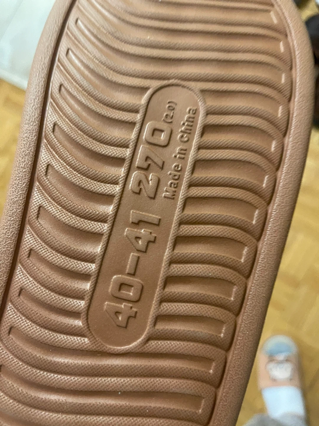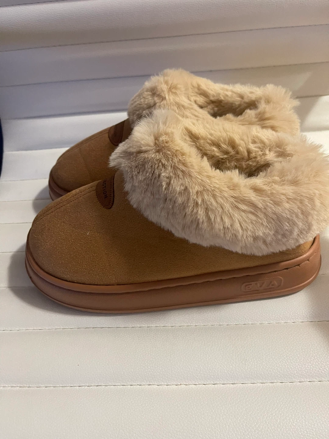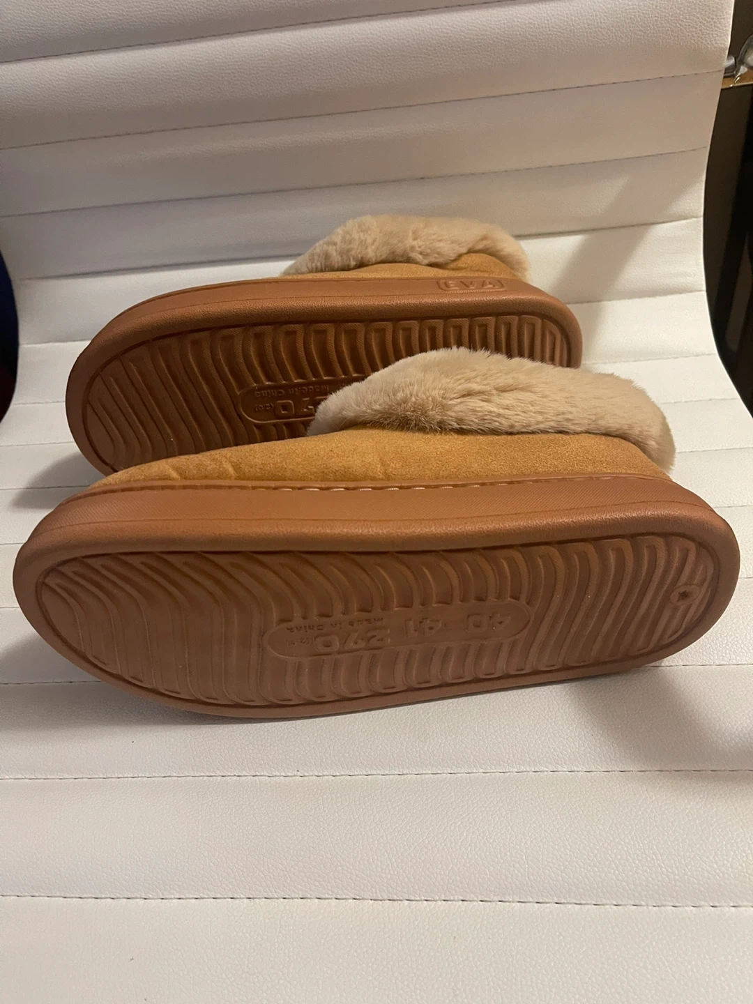 Comfy brown slippers with a soft faux fur lining. Made in China. Size 40-41 (fits approx. 270mm). These slippers are great for keeping your feet warm around the house!