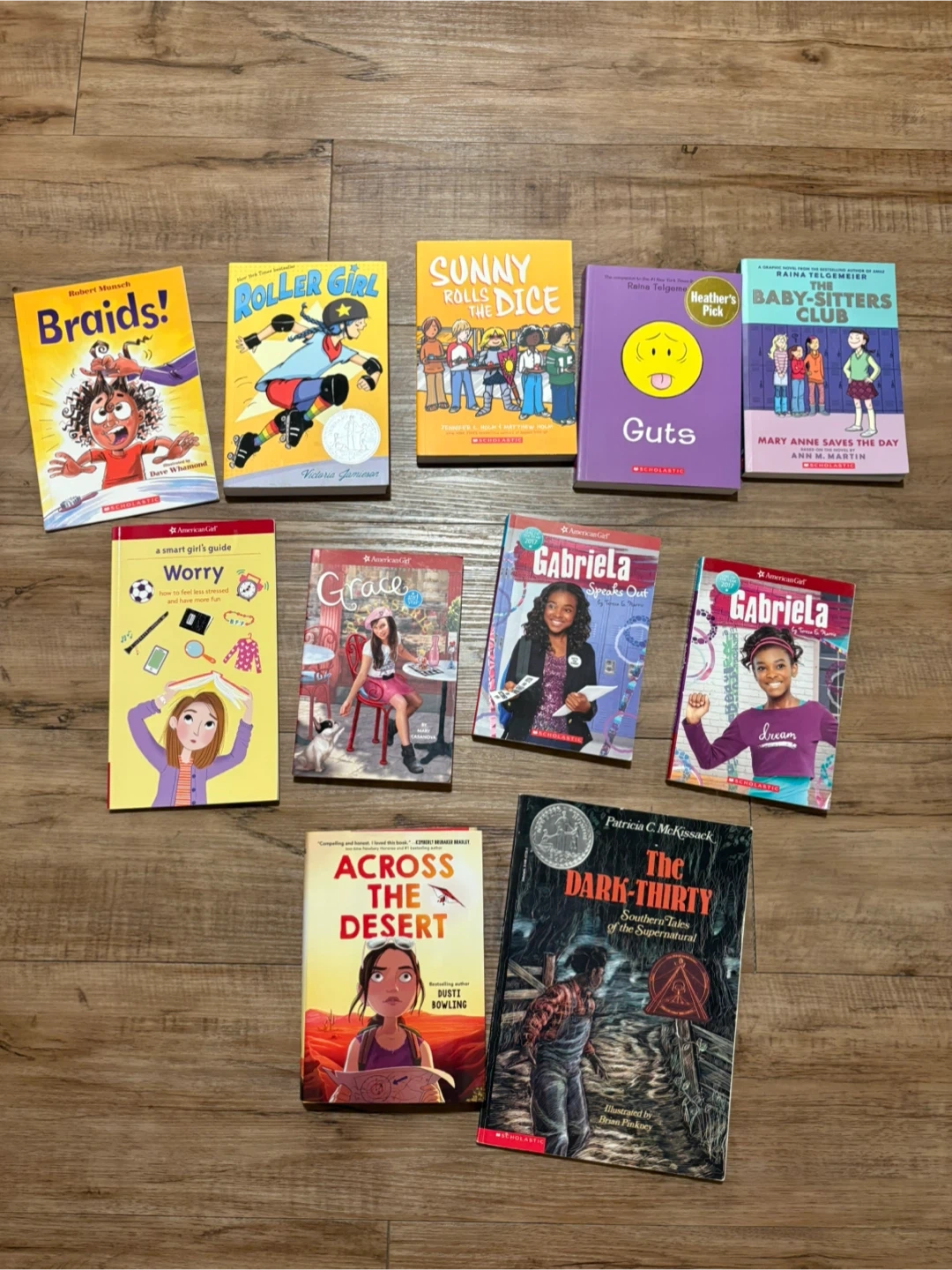 This lot includes a variety of children's books such as 'Braids!', 'Roller Girl', 'Sunny Rolls the Dice', 'Guts', 'The Baby-Sitters Club: Mary Anne Saves the Day', 'Worry', 'Grace', 'Gabriela Speaks Out', 'Gabriela', 'Across the Desert', and 'The Dark-Thirty'. These books offer diverse stories and reading levels for young readers.