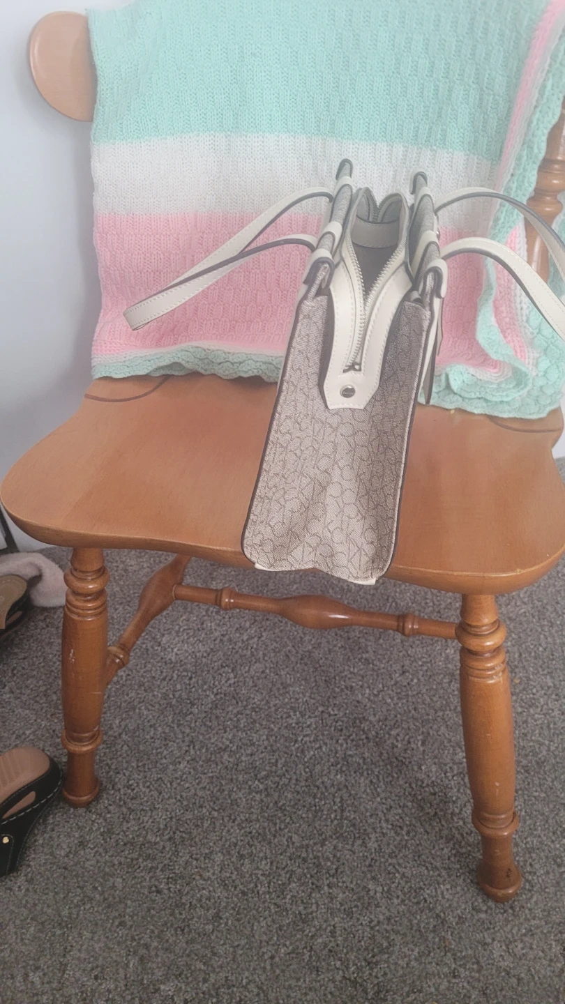 This Calvin Klein tote bag features the signature monogram pattern. It has a zip closure and dual top handles. The bag's trim and handles are a contrasting cream colour.