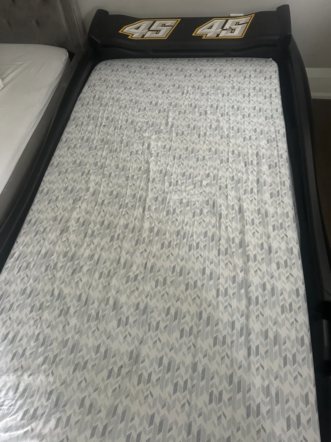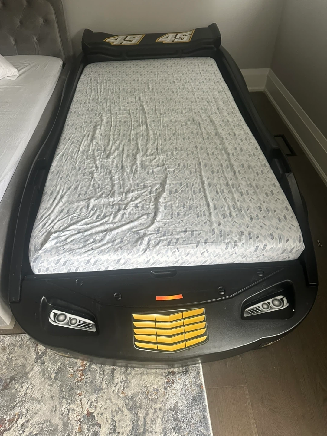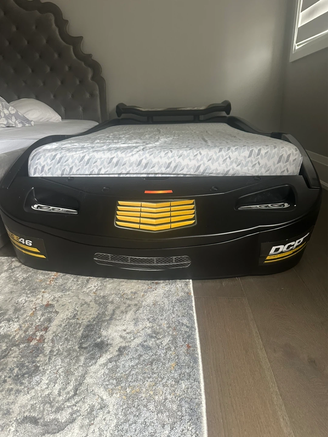 Black race car bed frame for kids. This bed frame has a fun race car design with realistic headlights and a grill. It's a great way to make bedtime exciting for a child. The frame is made of durable plastic.