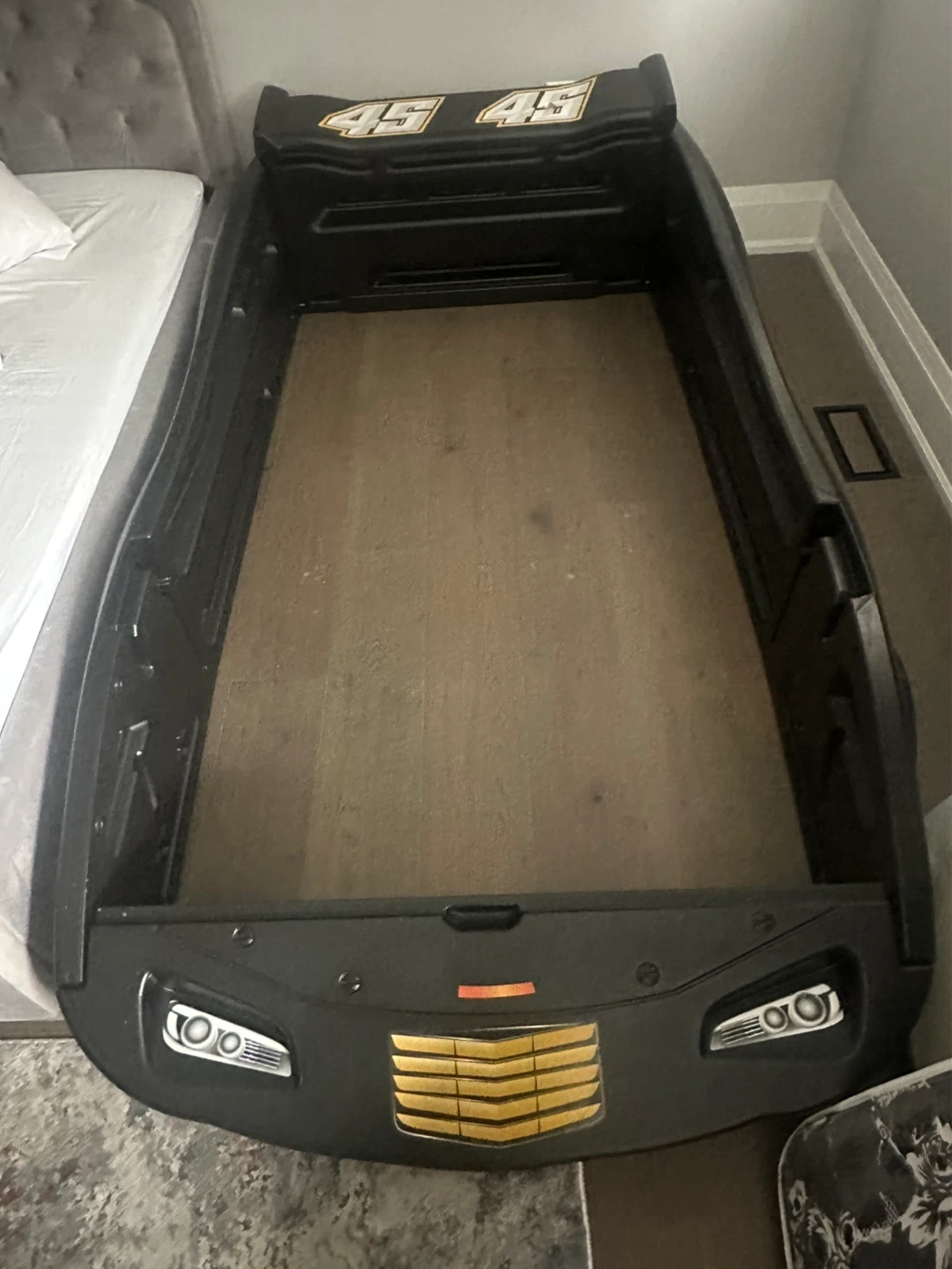 Black race car bed frame for kids. This bed frame has a fun race car design with realistic headlights and a grill. It's a great way to make bedtime exciting for a child. The frame is made of durable plastic.