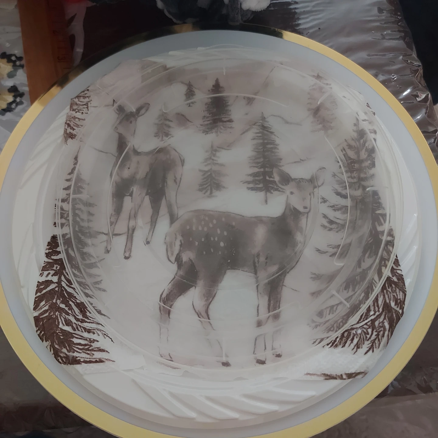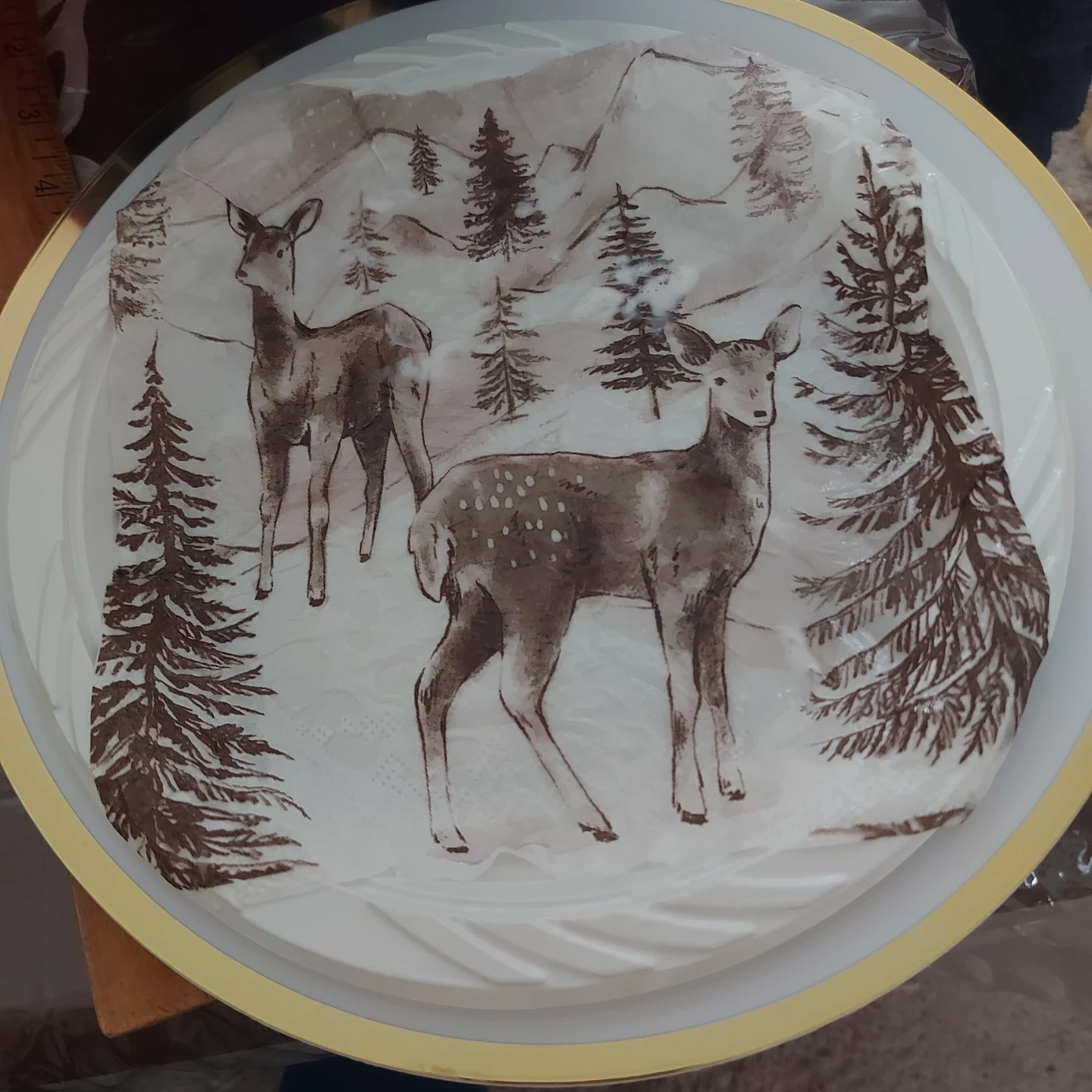 A decorative plate featuring a charming winter scene with deer and pine trees. It has a unique watercolor-style print. This plate is great for adding a rustic touch to your home decor! You can also hang it up too. Or you can serve a light snack over it on a clear plate.