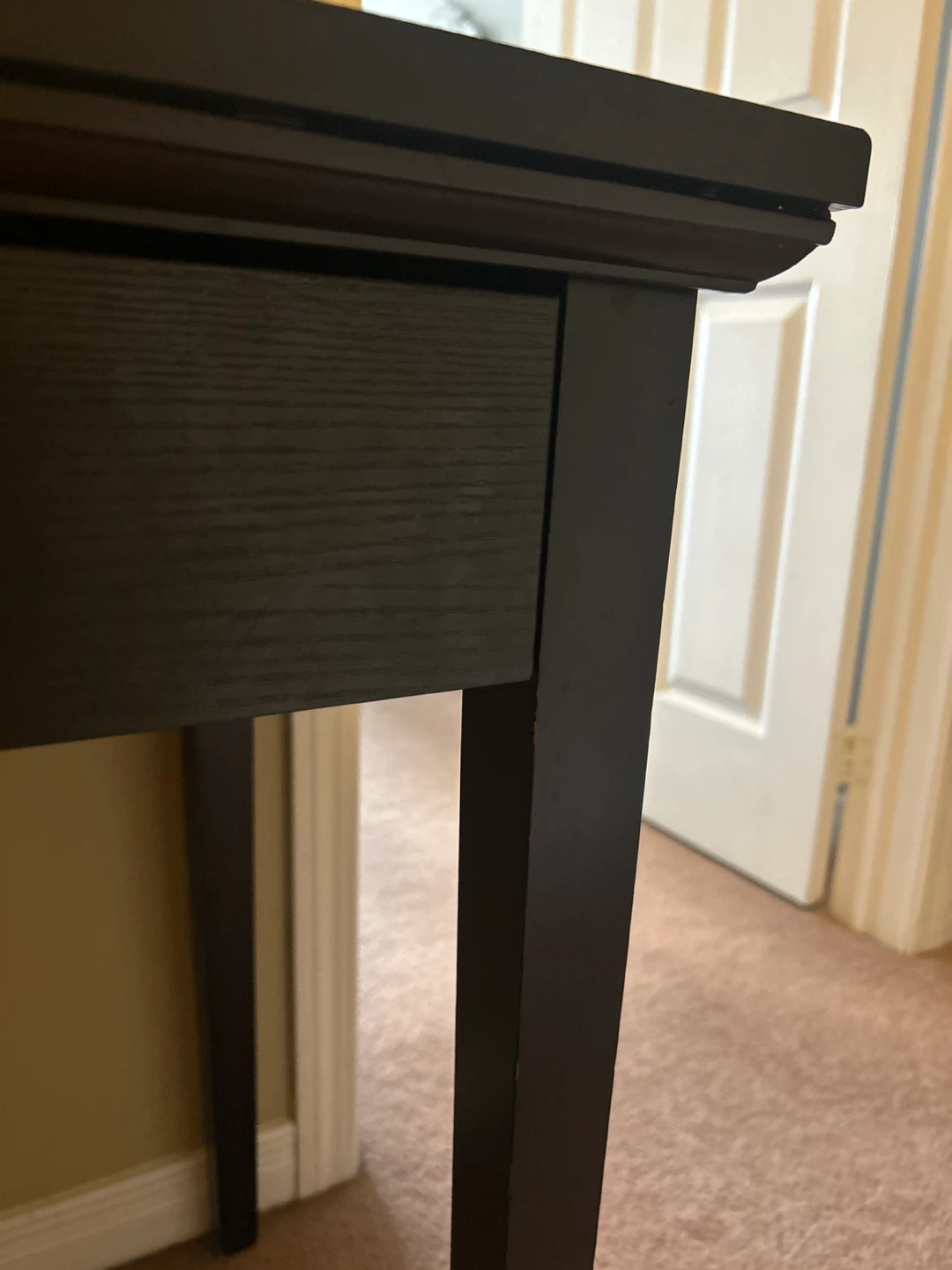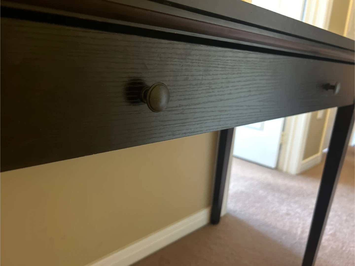 Dark brown wooden console table or small desk. Has a large drawer. In working condition with no issues (but has small dents- see photo)