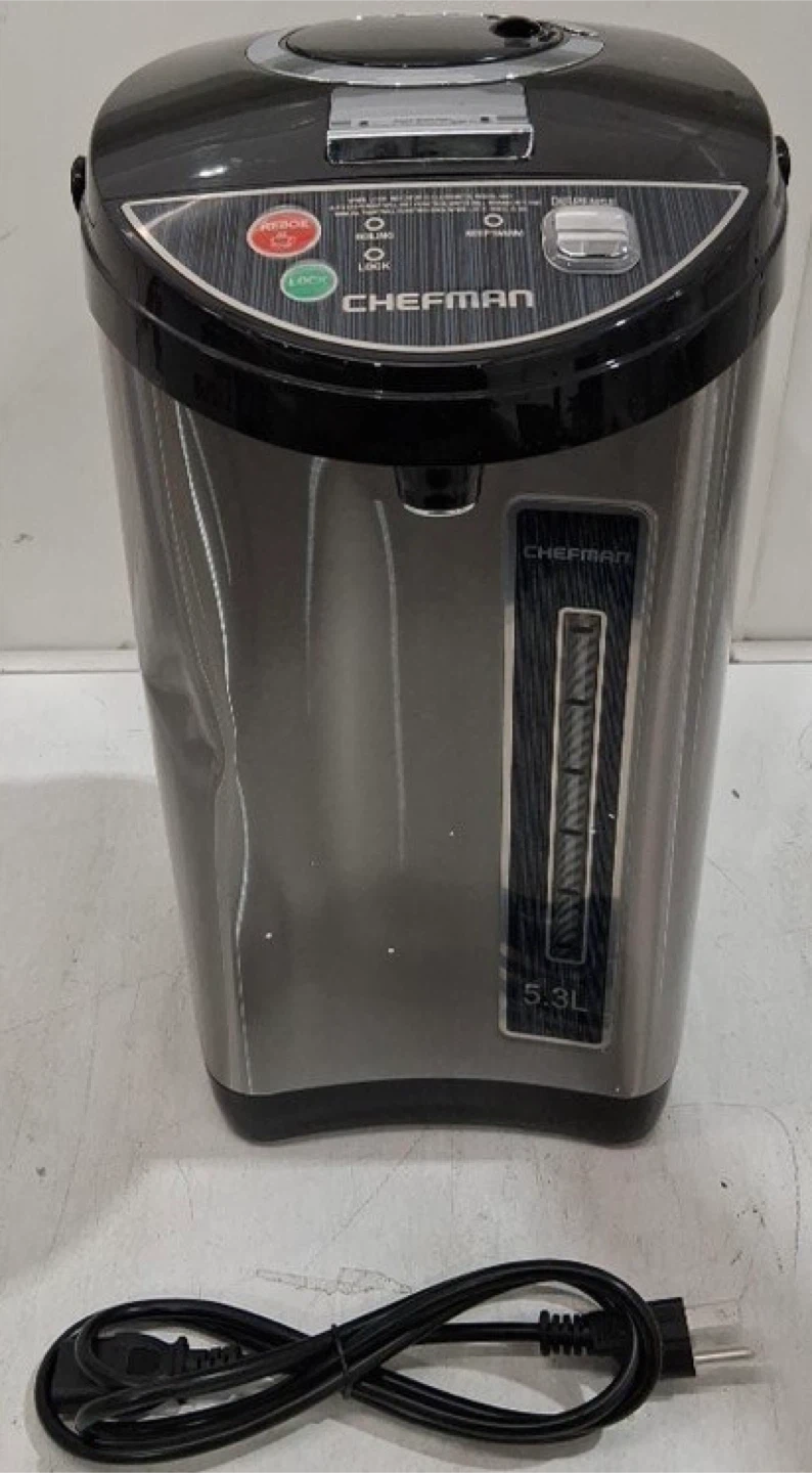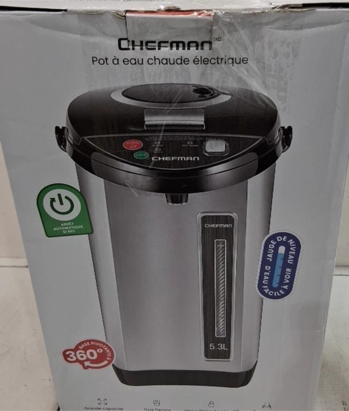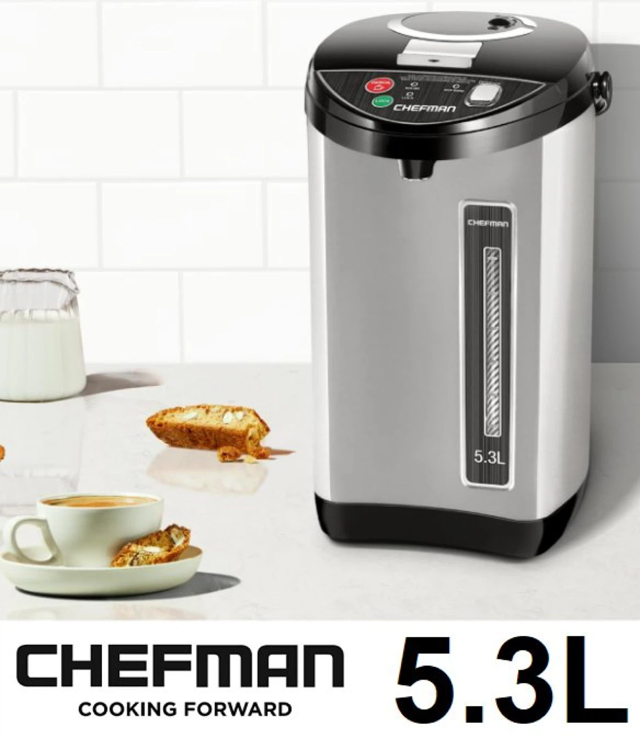This Chefman electric hot water pot has a 5.3L capacity. It features automatic shut-off and a 360-degree swivel base. Perfect for keeping water hot for tea or coffee.
