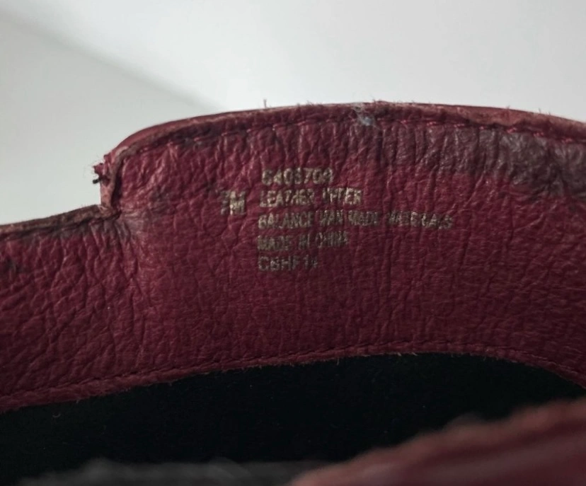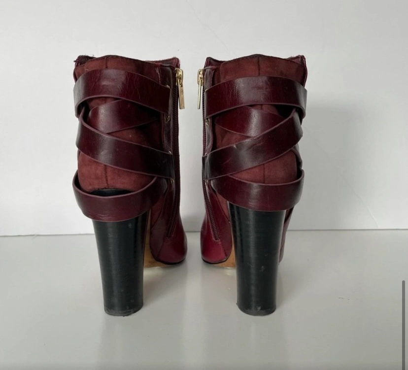 Burgundy leather ankle boots with a chunky heel and side zipper closure. Leather straps with gold accents.
