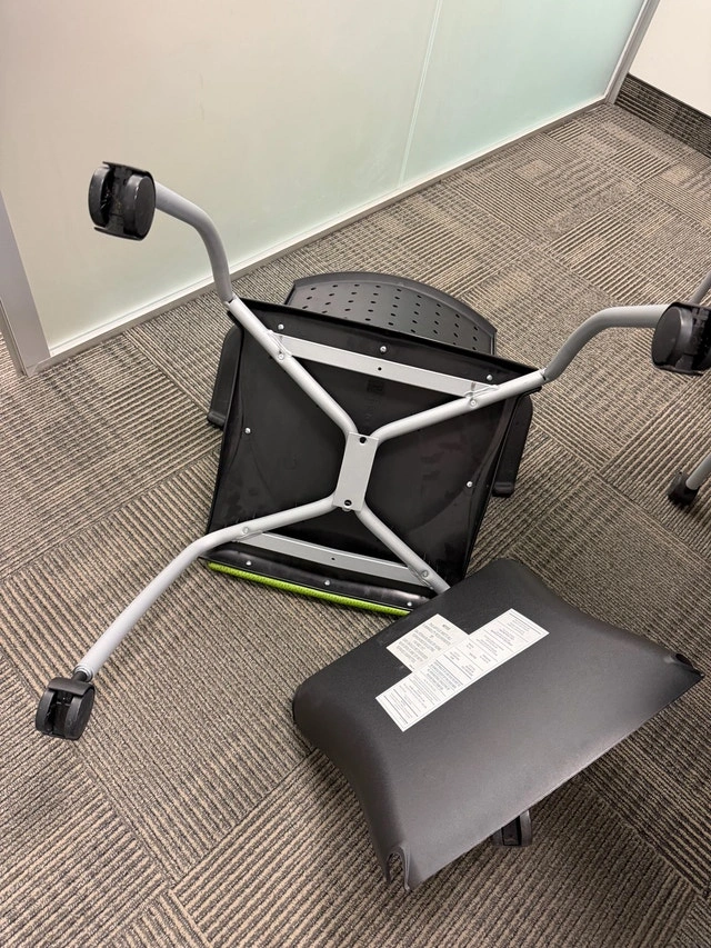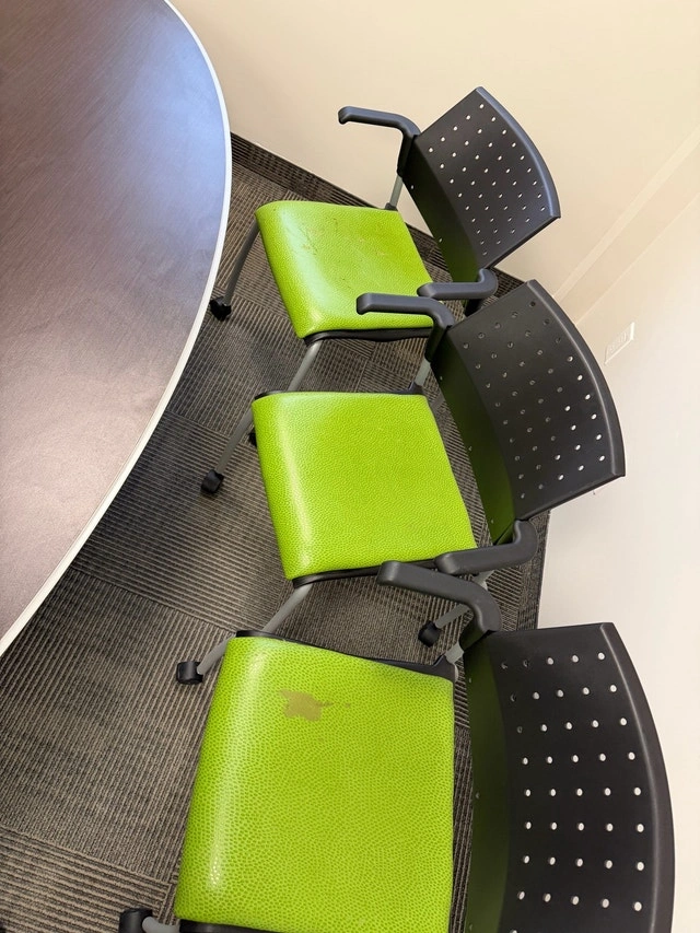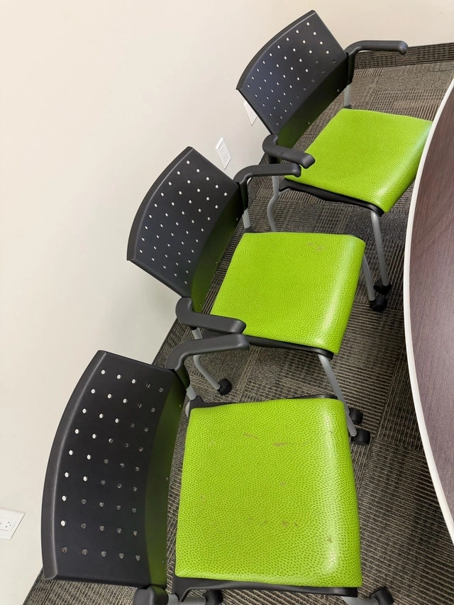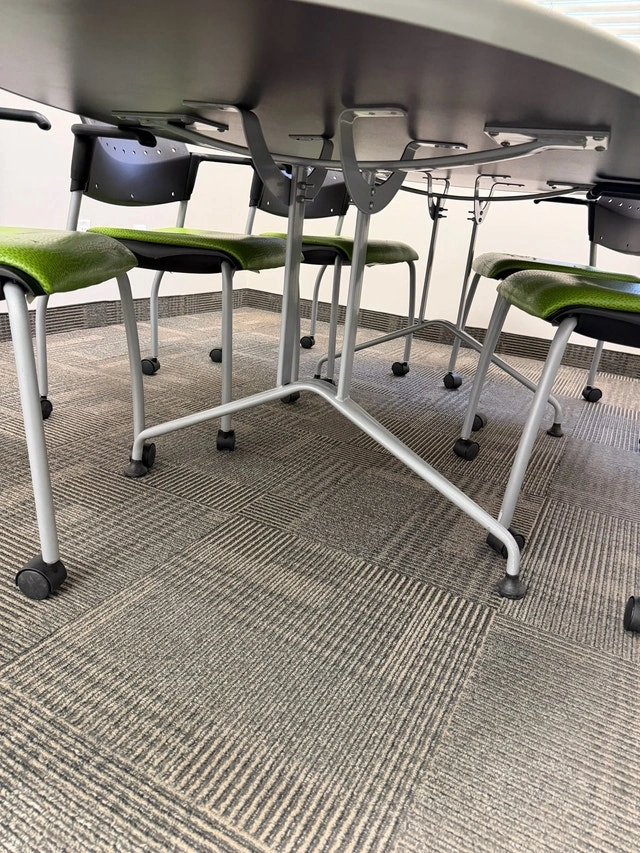 Oval small boardroom table with 6 chairs with armrests and wheels, measuring 7ft by 44.5” on the widest parts. The chairs are in good condition, other than the fabric of the cushions peeling. The base of the chairs can be removed, and you can easily put a new piece of material/fabric on them. The base of the table will need to be taken off for removal out of the office. Located behind Vaughan Mills.