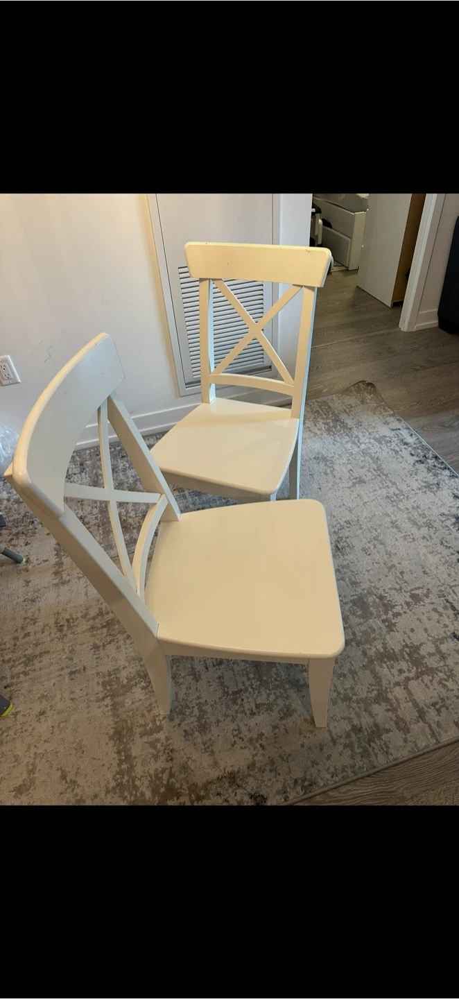Selling a lovely IKEA INGATORP extendable table in white, along with 4 matching chairs! The table is perfect for smaller spaces . The dimensions are 125 cm (49 1/4") x 75 cm (29 1/2"). The chairs are a classic design and complement the table nicely. Great for a kitchen or dining nook!