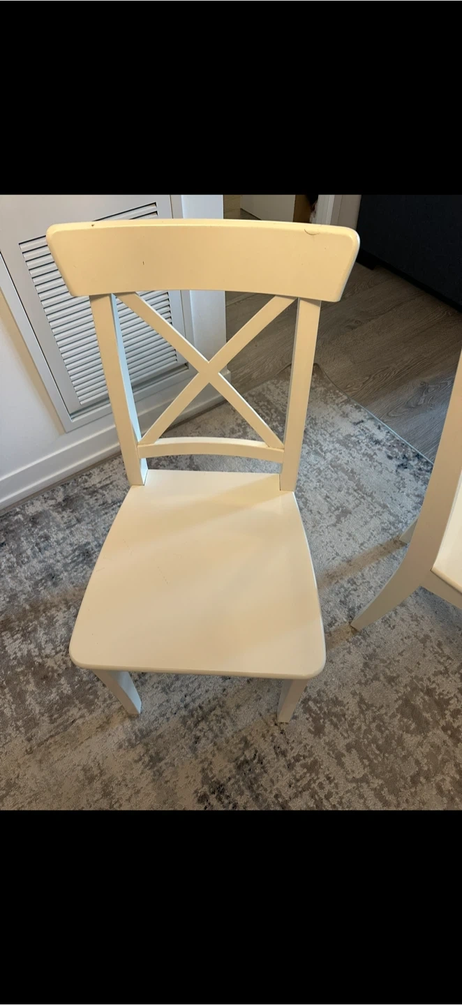 Selling a lovely IKEA INGATORP extendable table in white, along with 4 matching chairs! The table is perfect for smaller spaces . The dimensions are 125 cm (49 1/4") x 75 cm (29 1/2"). The chairs are a classic design and complement the table nicely. Great for a kitchen or dining nook!