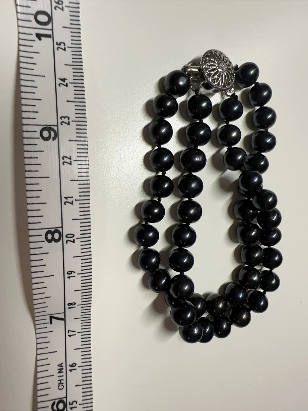 This elegant double strand bracelet features lustrous black pearls and a decorative silver clasp. The pearls are strung on durable thread. The clasp is a round, ornate silver piece. It's suitable for adding a touch of sophistication to any outfit.