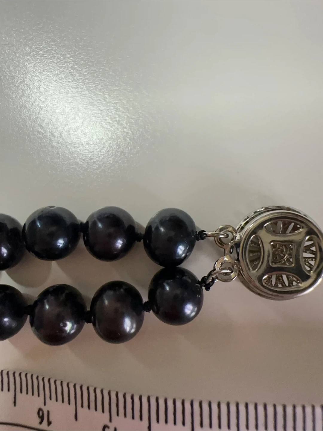 This elegant double strand bracelet features lustrous black pearls and a decorative silver clasp. The pearls are strung on durable thread. The clasp is a round, ornate silver piece. It's suitable for adding a touch of sophistication to any outfit.
