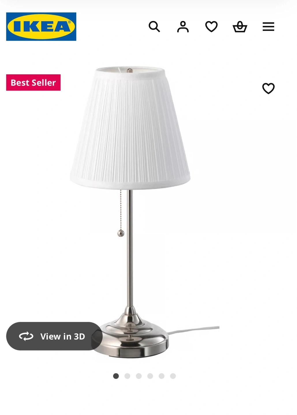 This is an IKEA table lamp with a white pleated shade. It features a pull chain for easy on/off. The base and stem are a brushed metal finish.