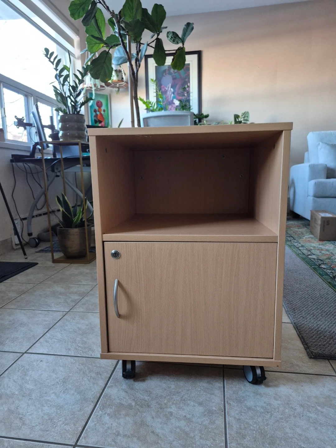 This rolling cabinet features a light wood finish and a locking drawer for secure storage. It's mounted on wheels for easy mobility. Ideal for organizing office supplies or personal items.