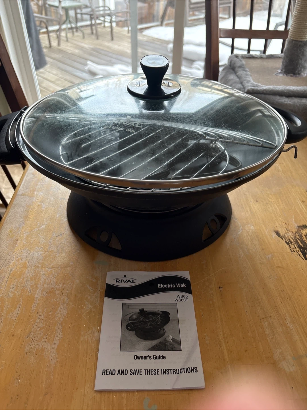 This is a Rival Electric Wok, model WS60. It comes with a glass lid and an owner's guide. It's a handy appliance for stir-frying and other quick cooking tasks.